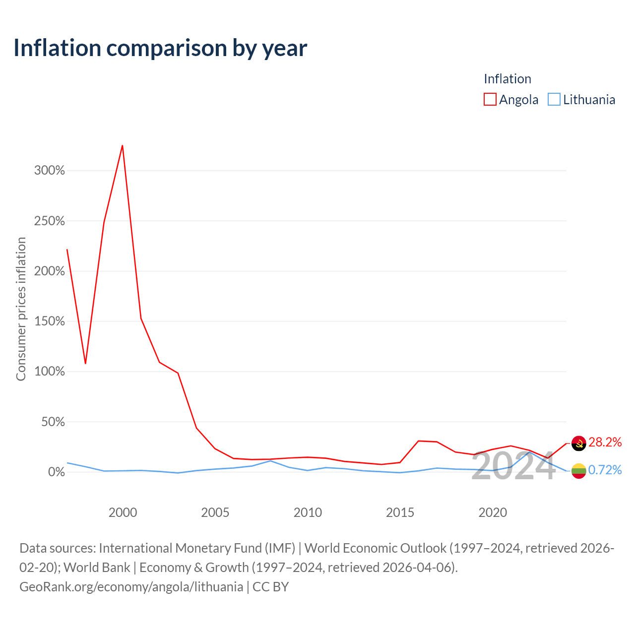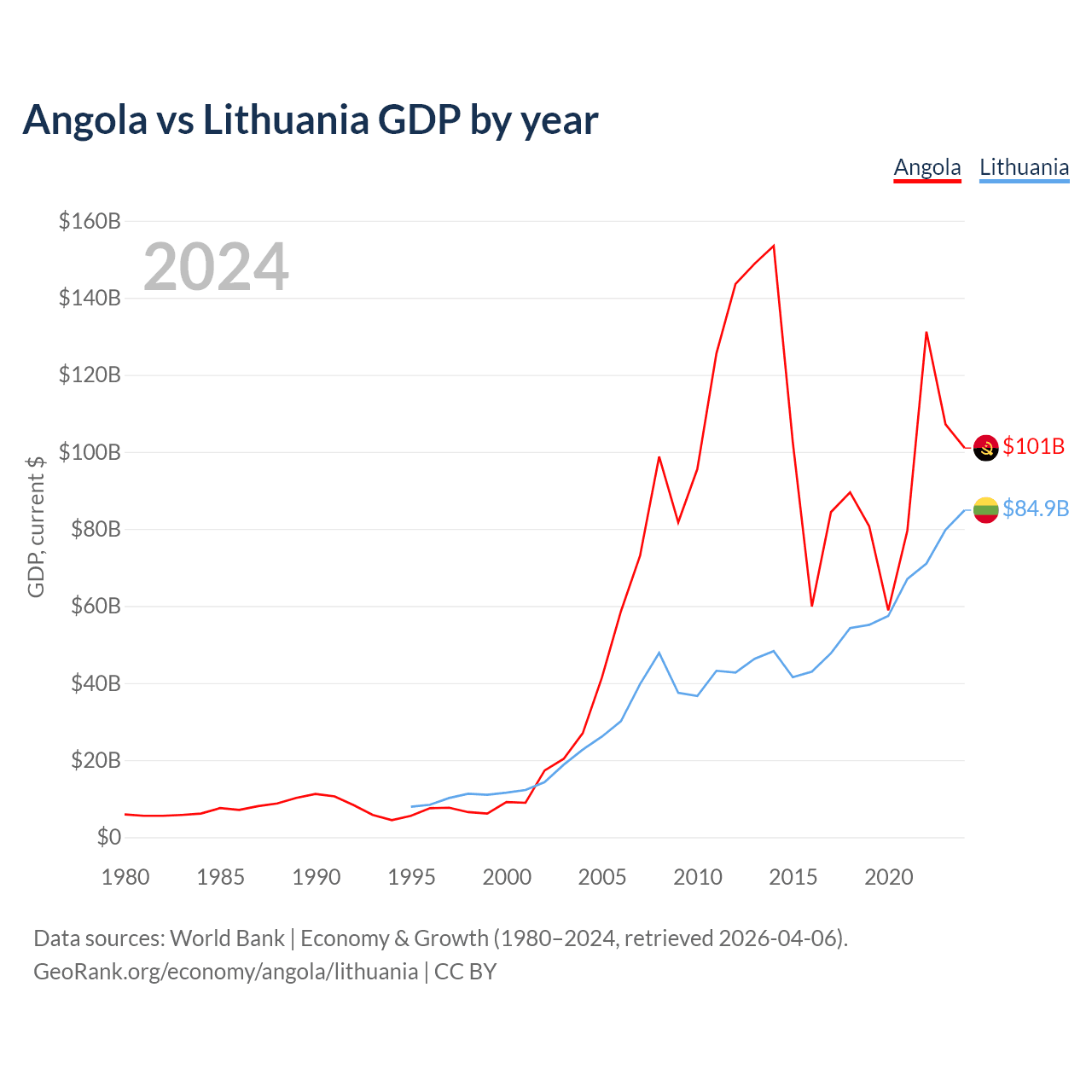 Angola has a GDP of $101B compared to $84.9B for Lithuania, ranking 71/197 and 79/197 by economy size, respectively.
