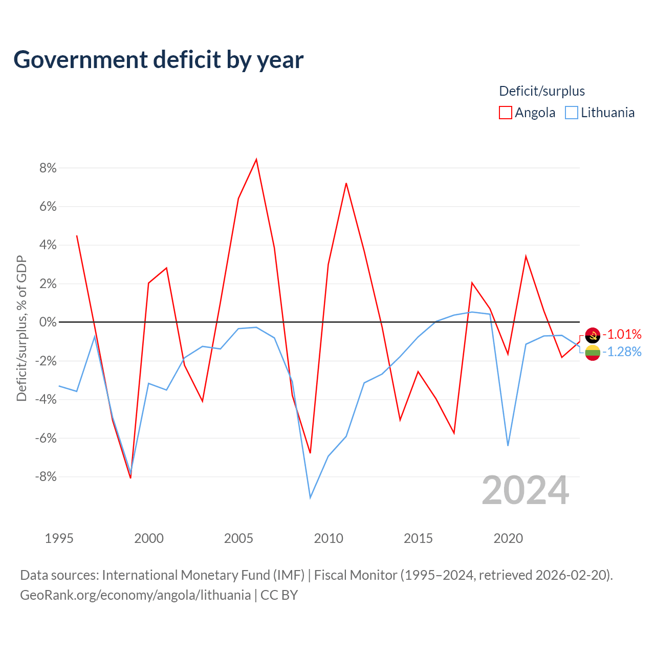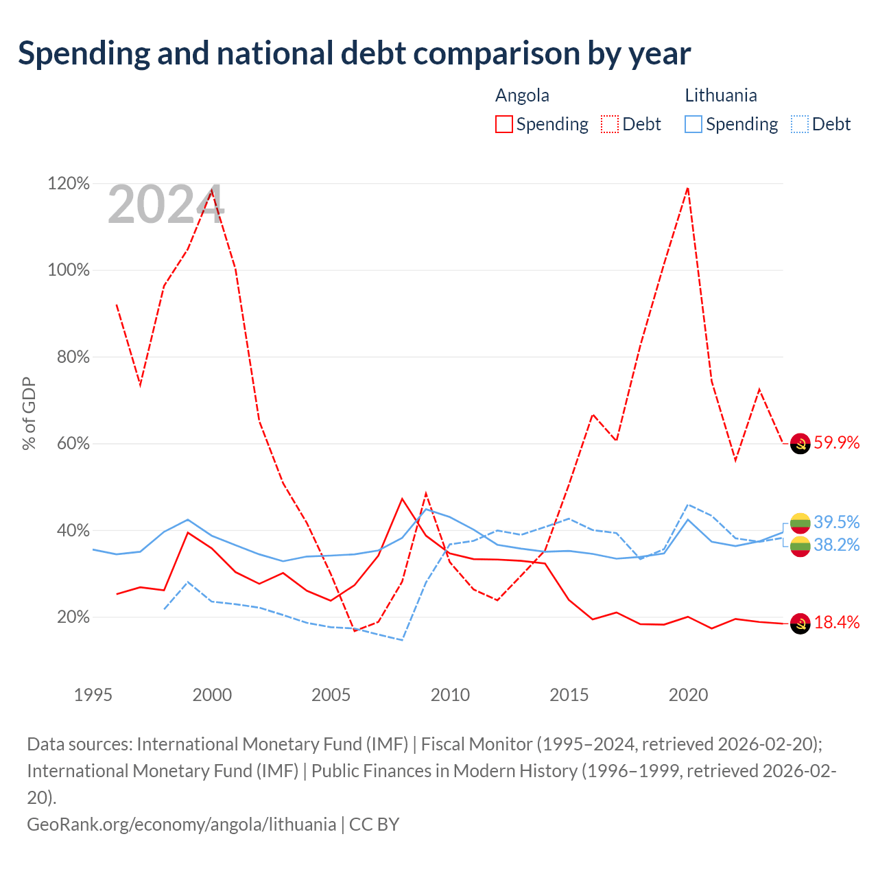 Angola has $60.5B in government debt (59.9% of GDP), compared to $32.4B (38.2% of GDP) in Lithuania.