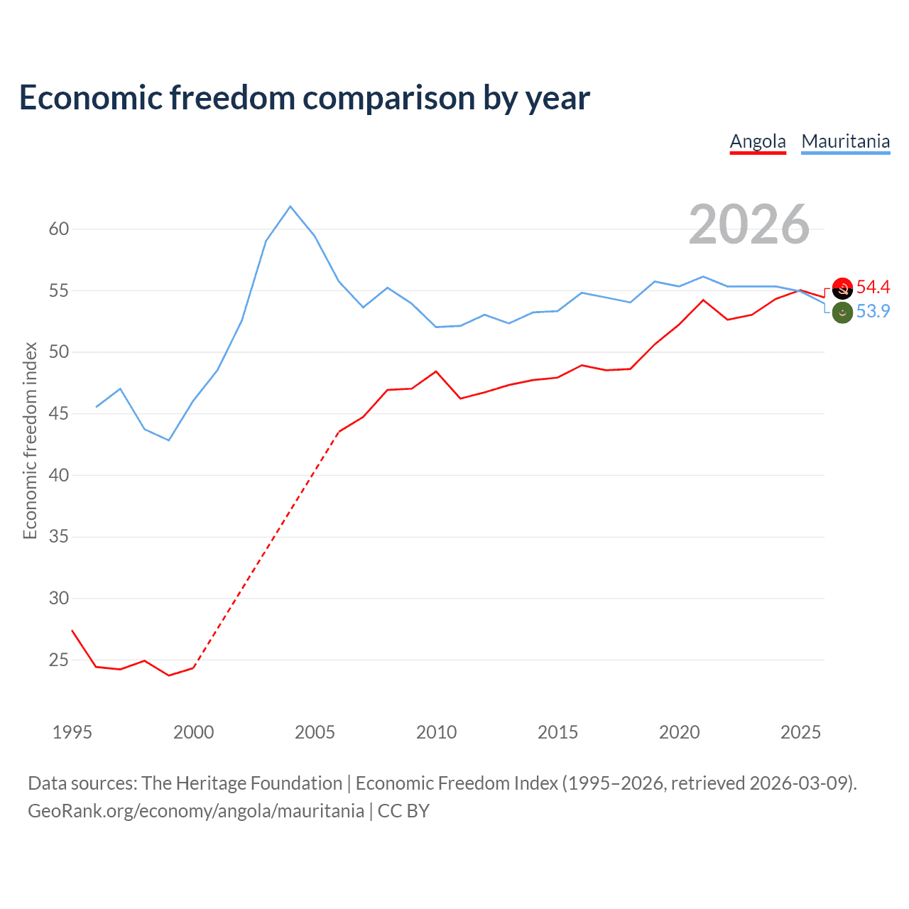 The Economic Freedom Index for Angola is 54.4, ranking 133/197, compared to 53.9 for Mauritania, ranking 136/197. The chart above displays a comparison of annual changes in economic freedom indexes.