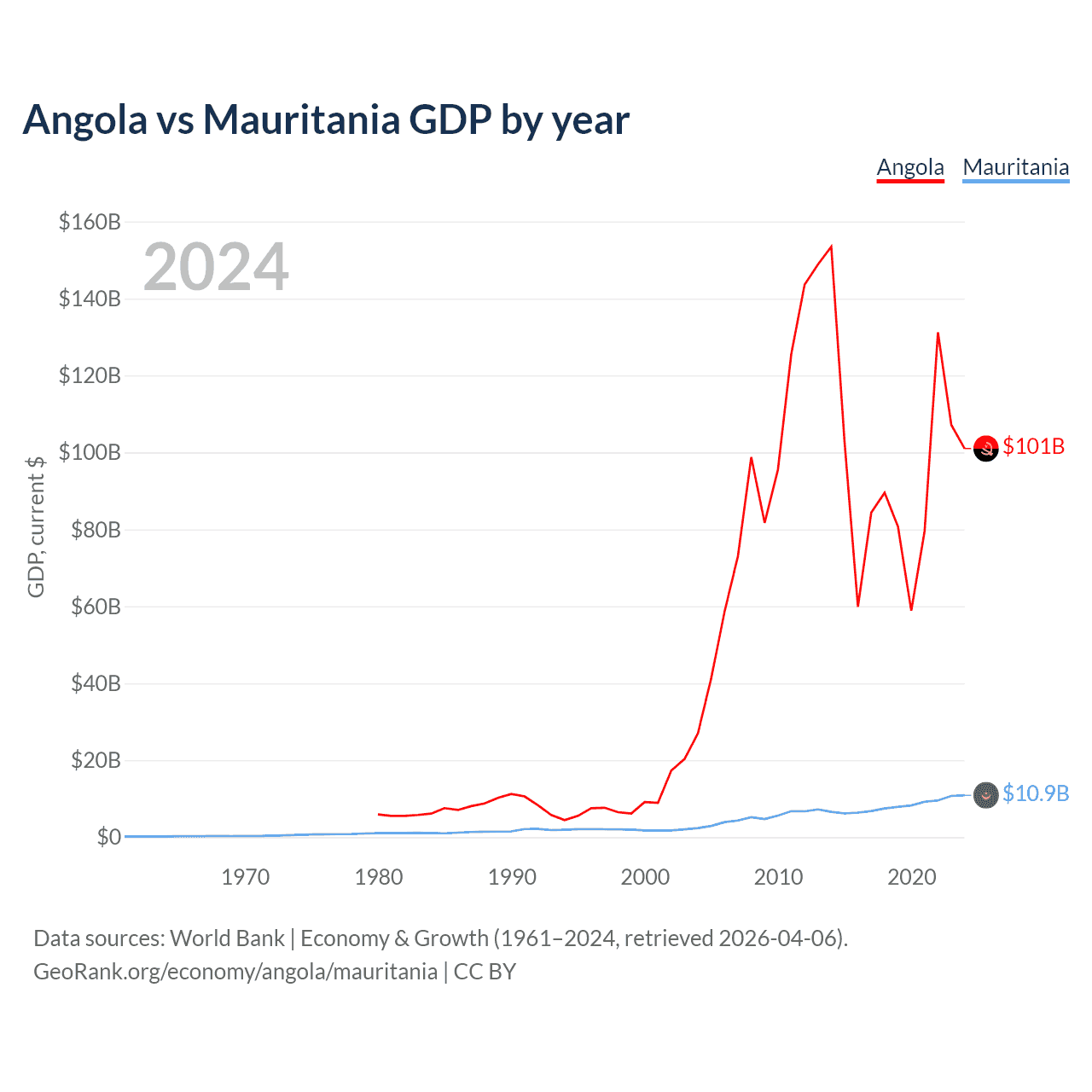 Angola has a GDP of $101B compared to $10.9B for Mauritania, ranking 71/197 and 153/197 by economy size, respectively.