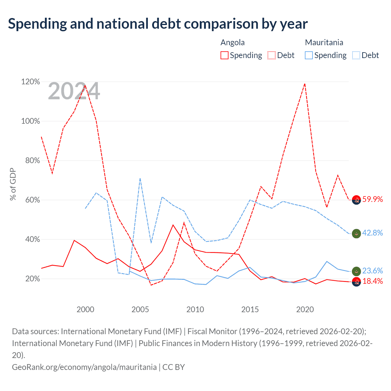 Angola has $60.5B in government debt (59.9% of GDP), compared to $4.67B (42.8% of GDP) in Mauritania.
