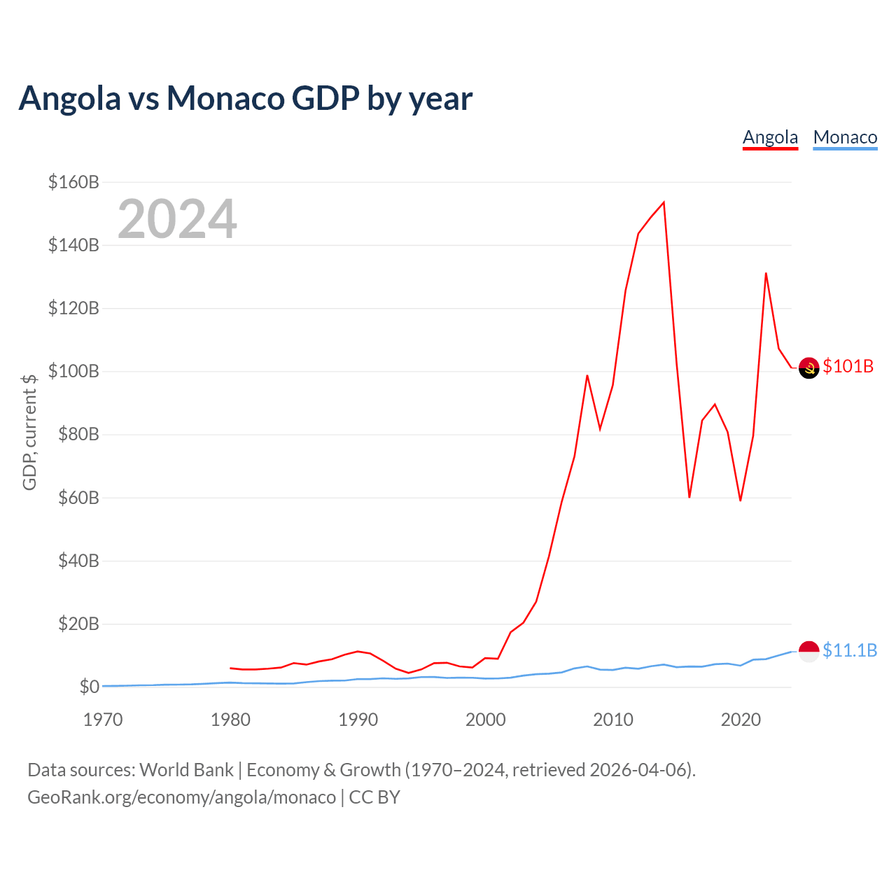 Angola has a GDP of $101B compared to $11.1B for Monaco, ranking 71/197 and 152/197 by economy size, respectively.