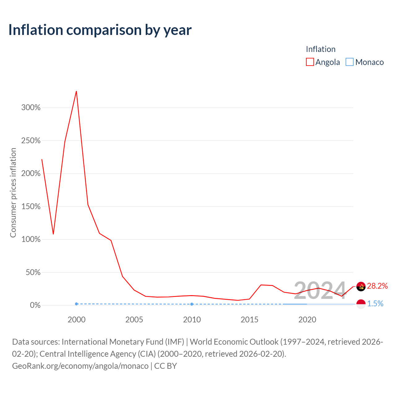 Over the past 21 years, Angola has recorded an average annual inflation rate of 47%, compared with 1.58% in Monaco. In 2020, inflation was 28.2% in Angola and 1.5% in Monaco.