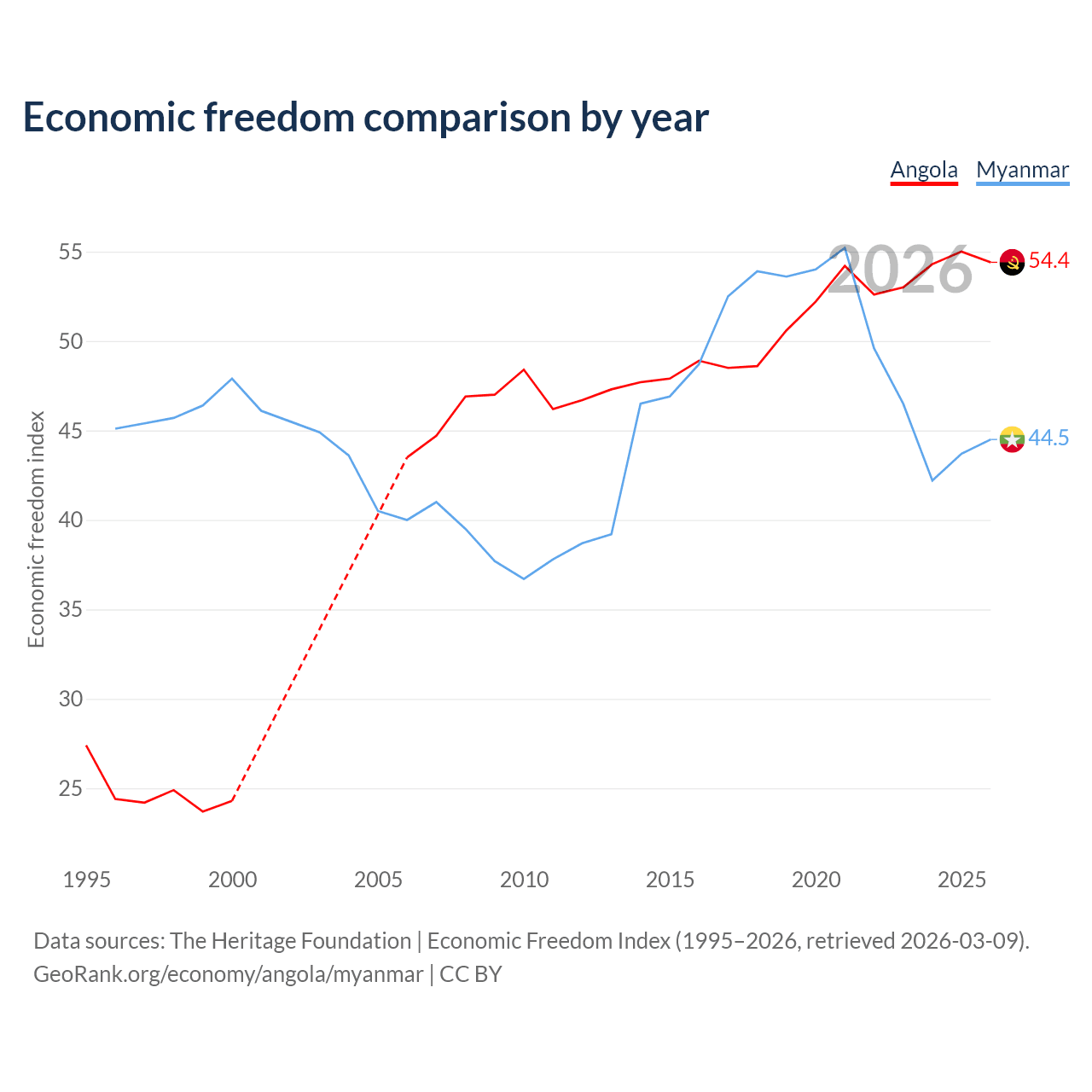 The Economic Freedom Index for Angola is 54.4, ranking 133/197, compared to 44.5 for Myanmar, ranking 180/197. The chart above displays a comparison of annual changes in economic freedom indexes.