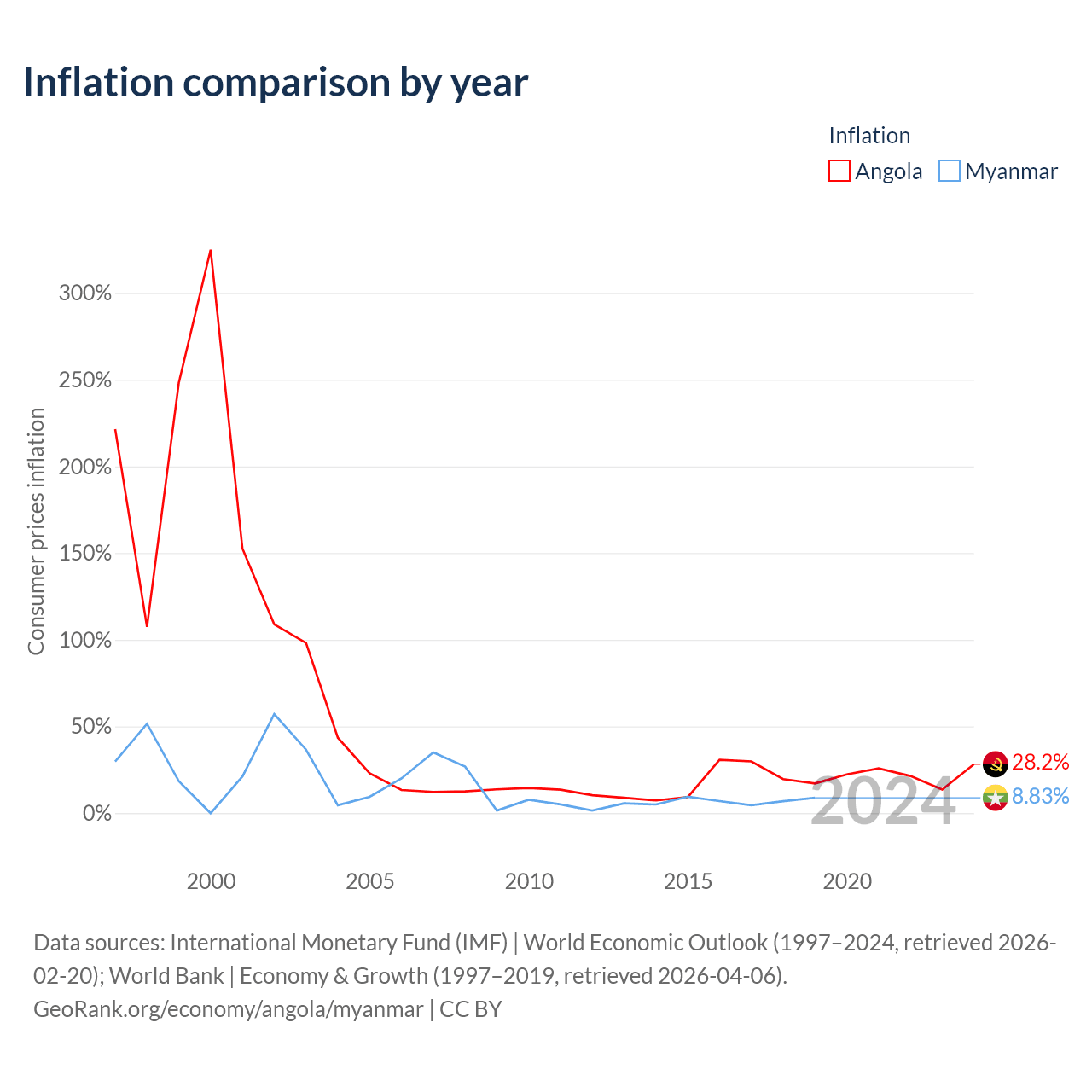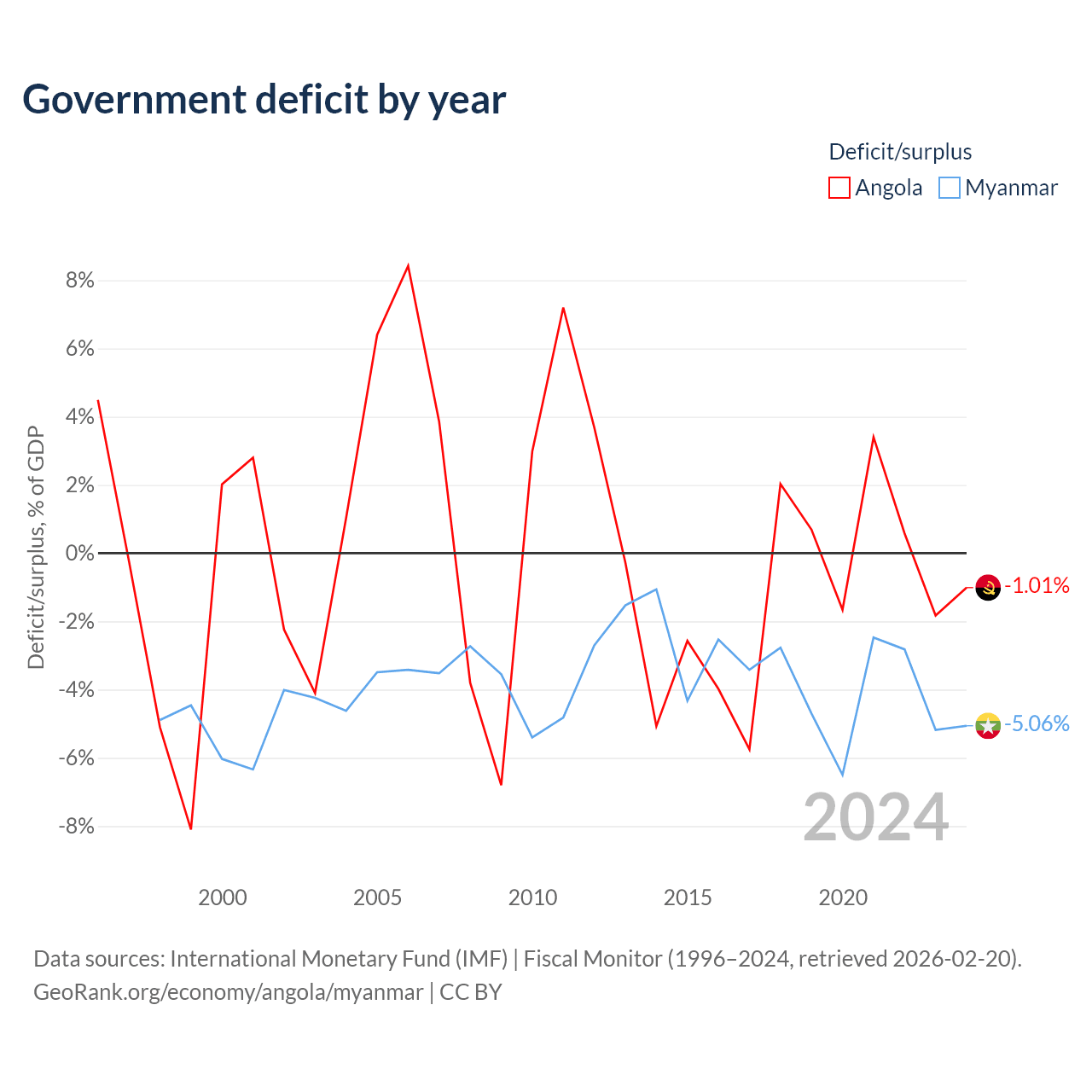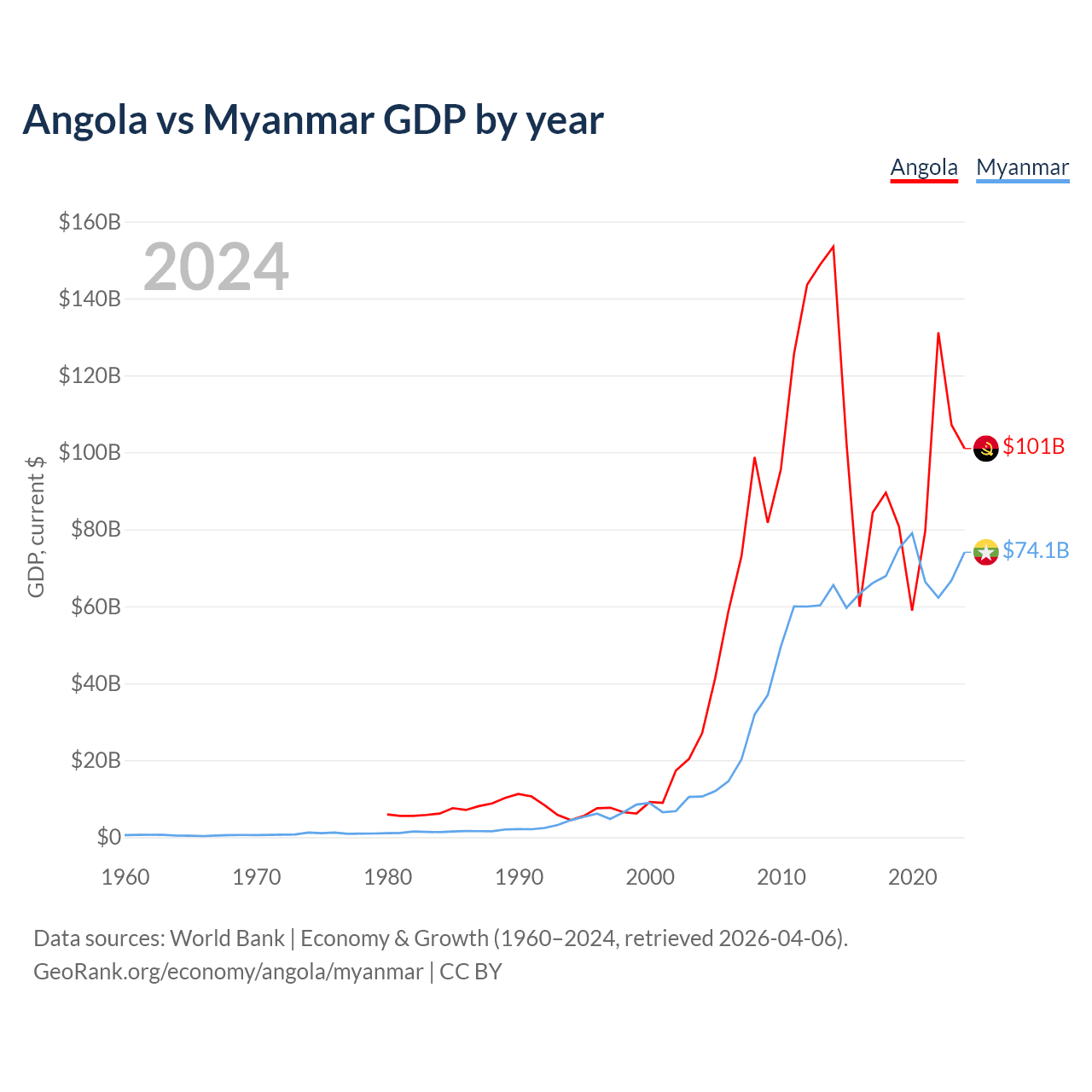 Angola has a GDP of $101B compared to $74.1B for Myanmar, ranking 71/197 and 85/197 by economy size, respectively.