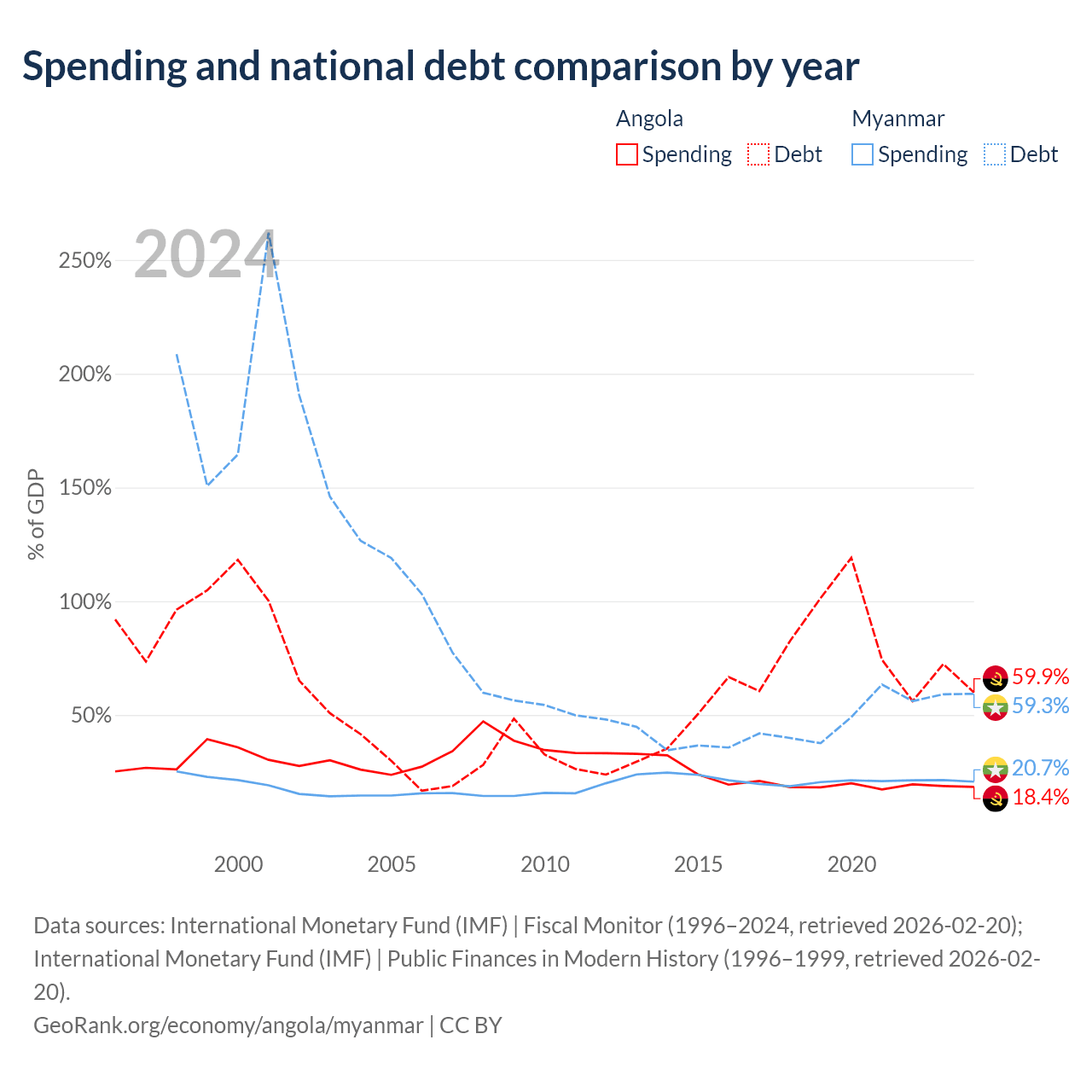 Angola has $60.5B in government debt (59.9% of GDP), compared to $44B (59.3% of GDP) in Myanmar.