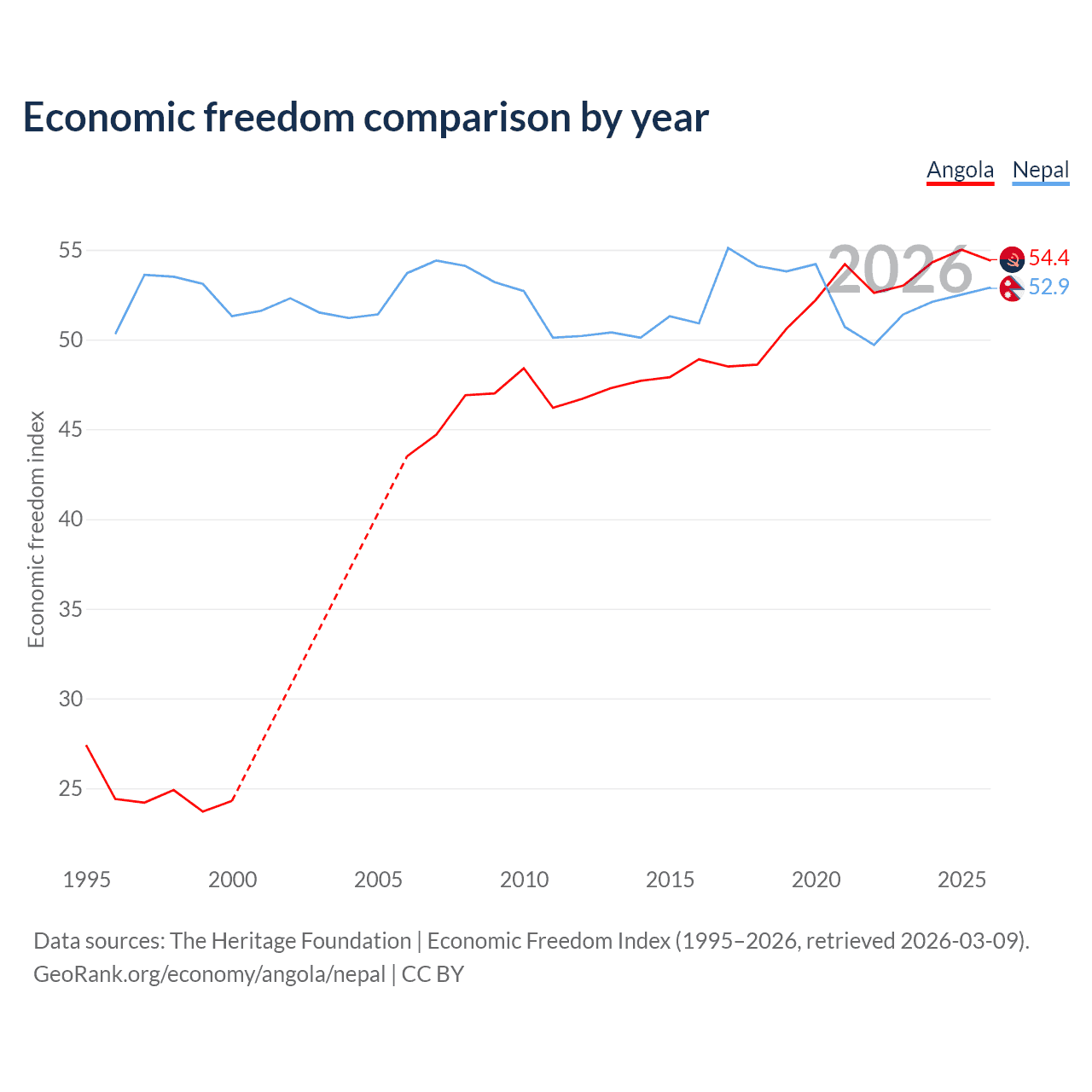 The Economic Freedom Index for Angola is 54.4, ranking 133/197, compared to 52.9 for Nepal, ranking 144/197. The chart above displays a comparison of annual changes in economic freedom indexes.