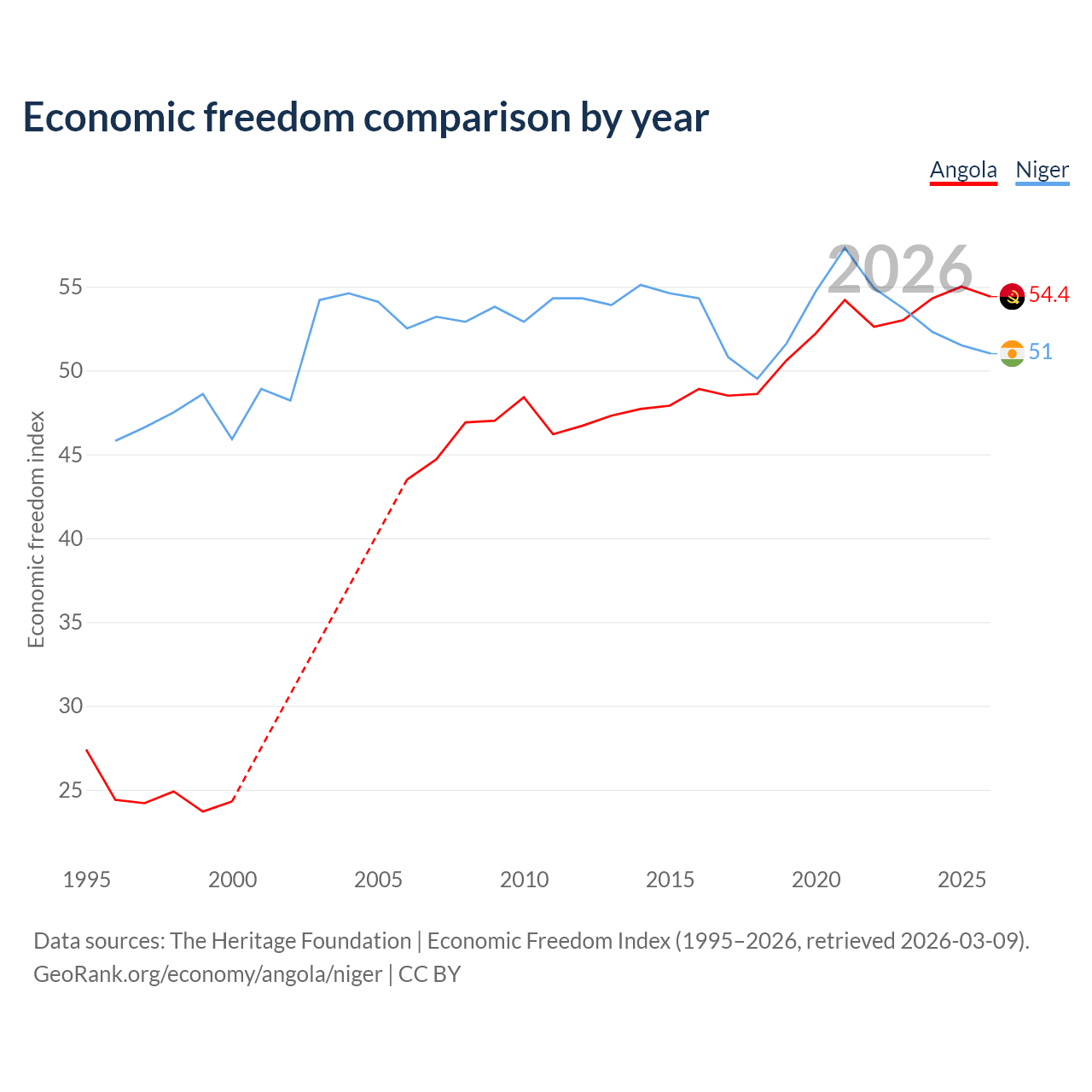 The Economic Freedom Index for Angola is 54.4, ranking 133/197, compared to 51 for Niger, ranking 156/197. The chart above displays a comparison of annual changes in economic freedom indexes.