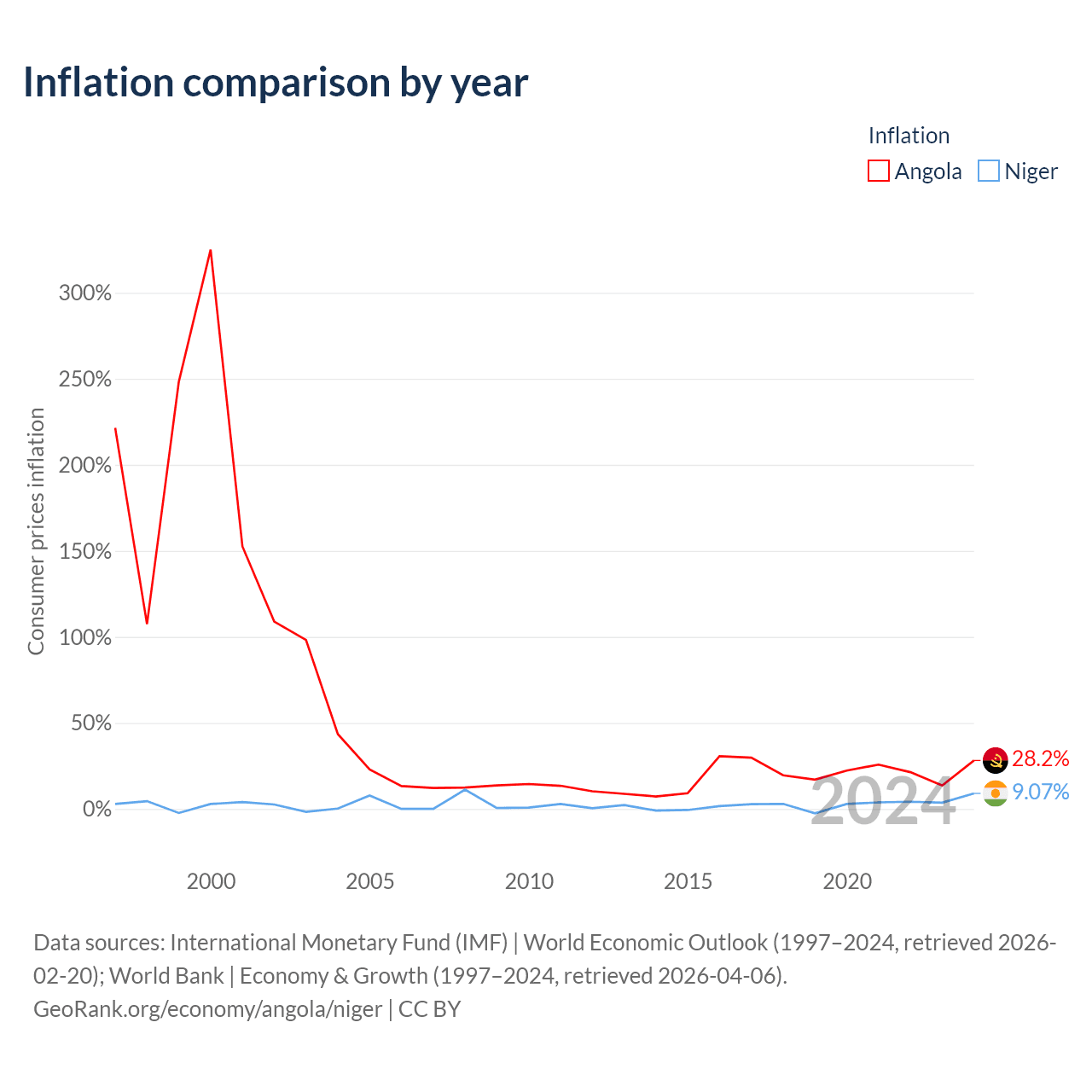 Angola has a GDP of $101B compared to $19.9B for Niger, ranking 71/197 and 130/197 by economy size, respectively.