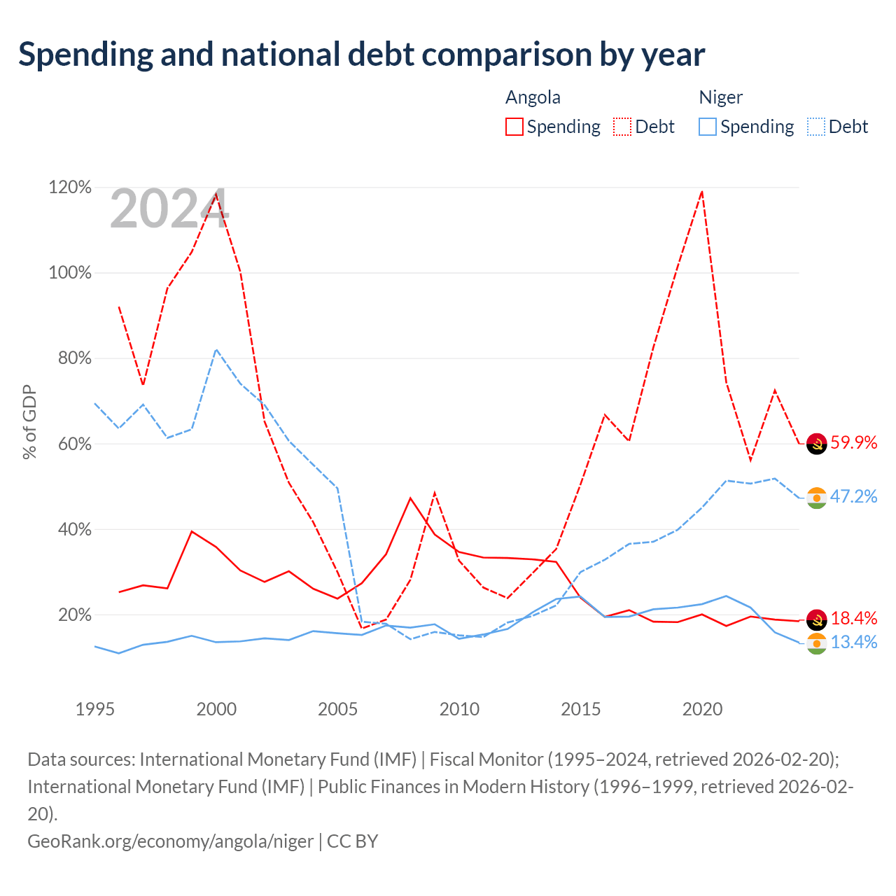 Angola has $60.5B in government debt (59.9% of GDP), compared to $9.39B (47.2% of GDP) in Niger.