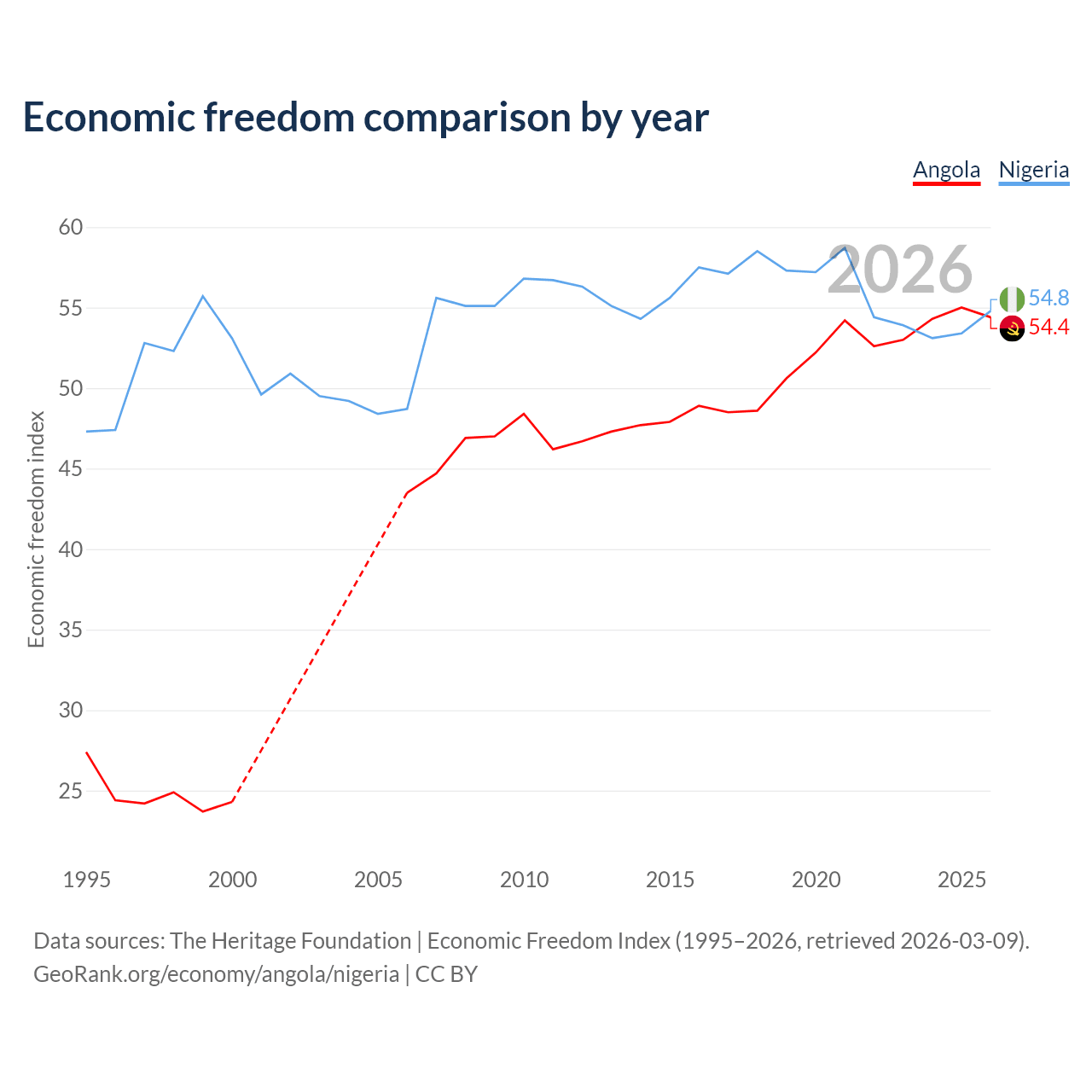 The Economic Freedom Index for Angola is 54.4, ranking 133/197, compared to 54.8 for Nigeria, ranking 132/197. The chart above displays a comparison of annual changes in economic freedom indexes.