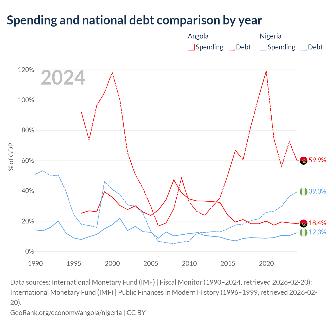 Angola has $60.5B in government debt (59.9% of GDP), compared to $99.2B (39.3% of GDP) in Nigeria.