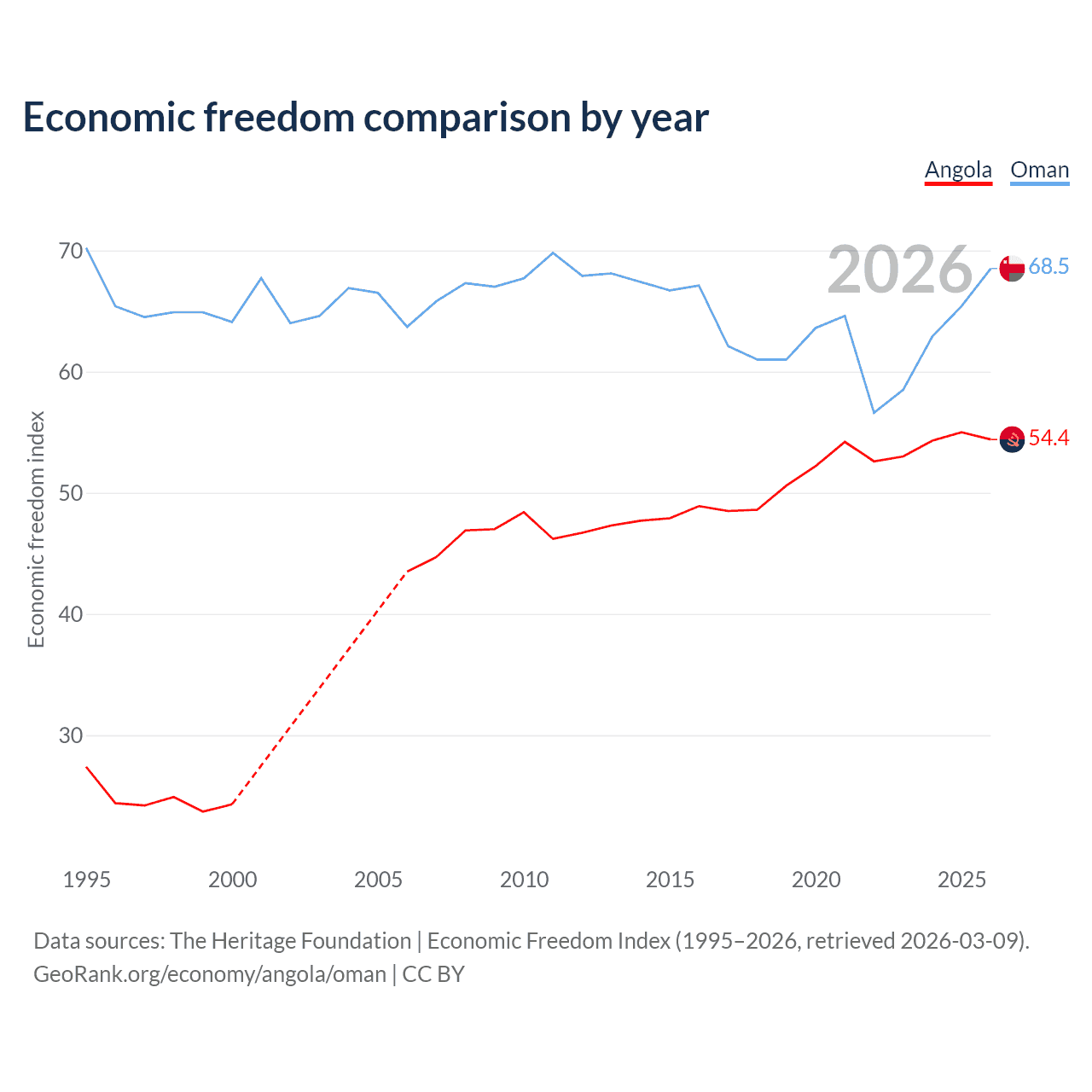 The Economic Freedom Index for Angola is 54.4, ranking 133/197, compared to 68.5 for Oman, ranking 45/197. The chart above displays a comparison of annual changes in economic freedom indexes.