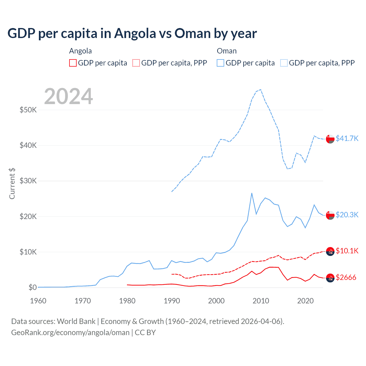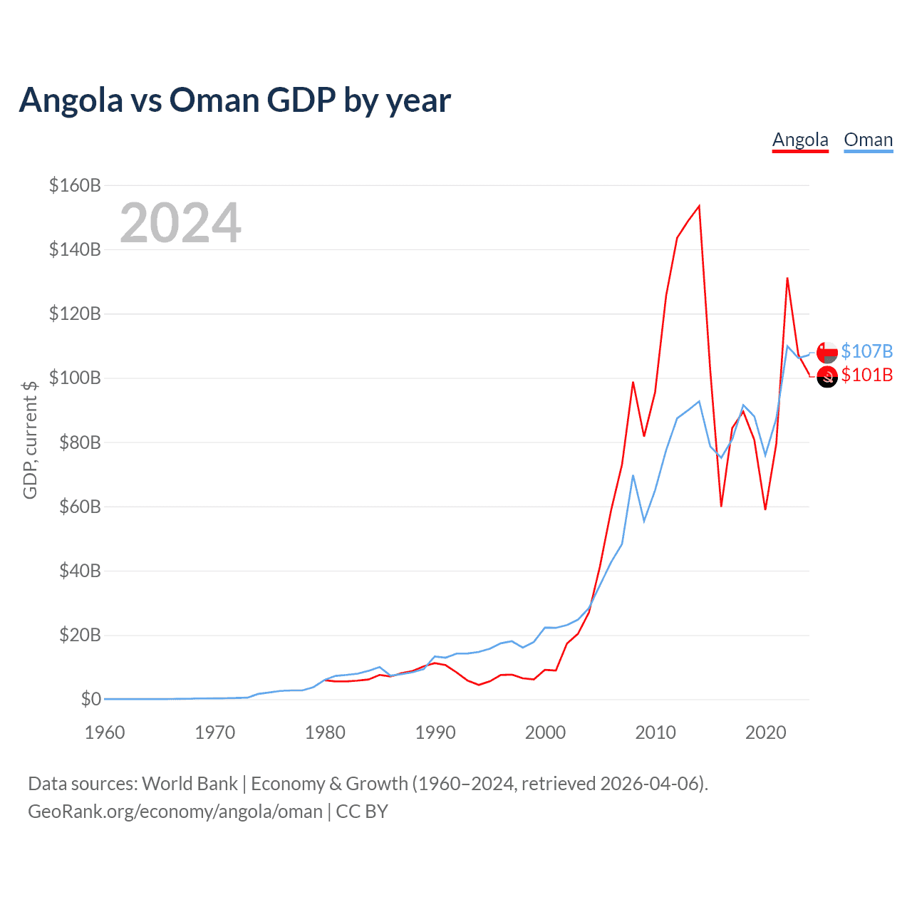 Angola has a GDP of $101B compared to $107B for Oman, ranking 71/197 and 70/197 by economy size, respectively.