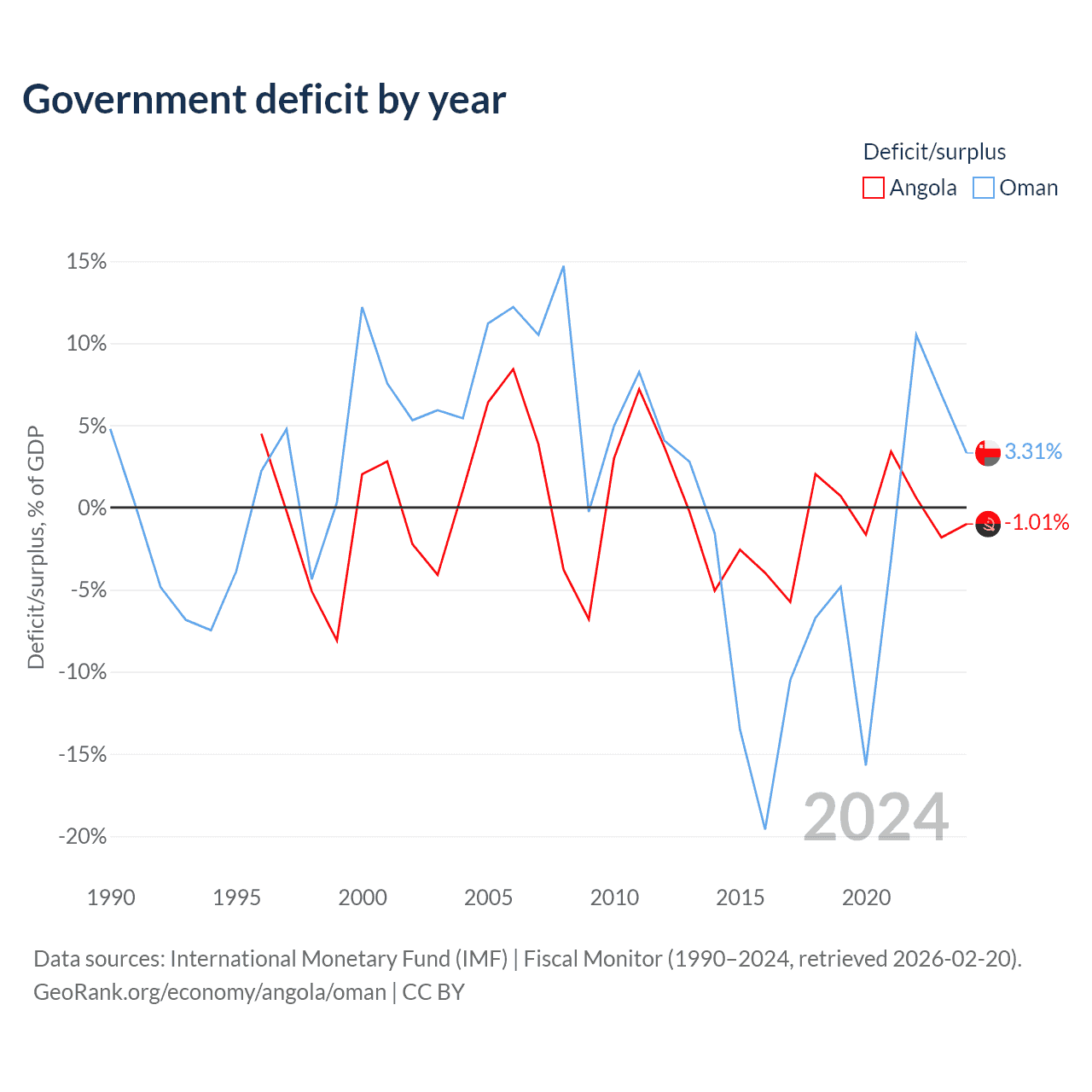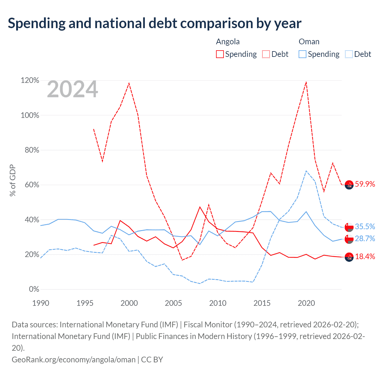 Angola has $60.5B in government debt (59.9% of GDP), compared to $38B (35.5% of GDP) in Oman.