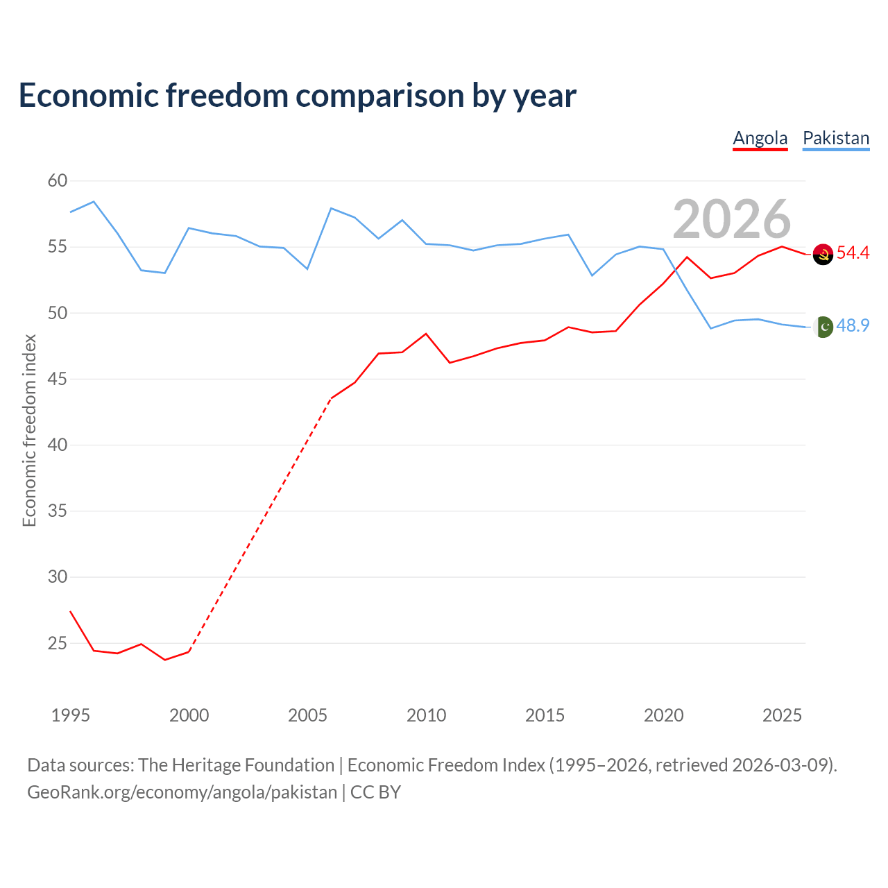 The Economic Freedom Index for Angola is 54.4, ranking 133/197, compared to 48.9 for Pakistan, ranking 168/197. The chart above displays a comparison of annual changes in economic freedom indexes.