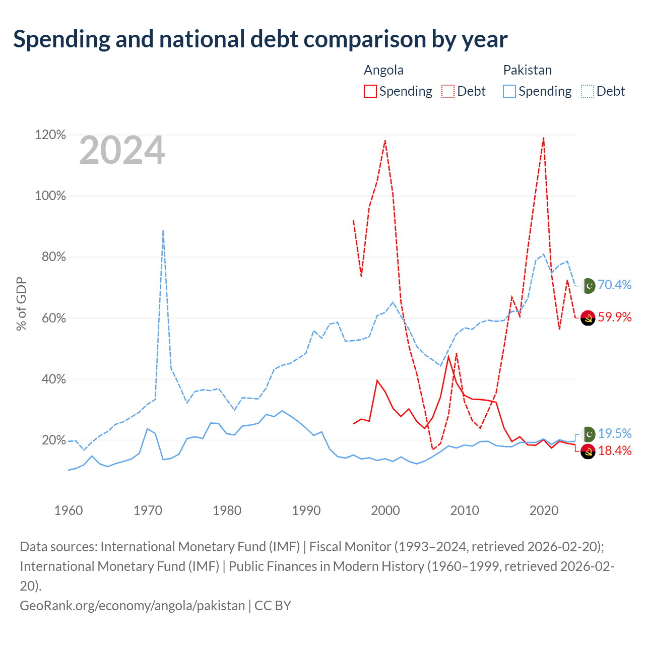 Angola has $60.5B in government debt (59.9% of GDP), compared to $262B (70.4% of GDP) in Pakistan.