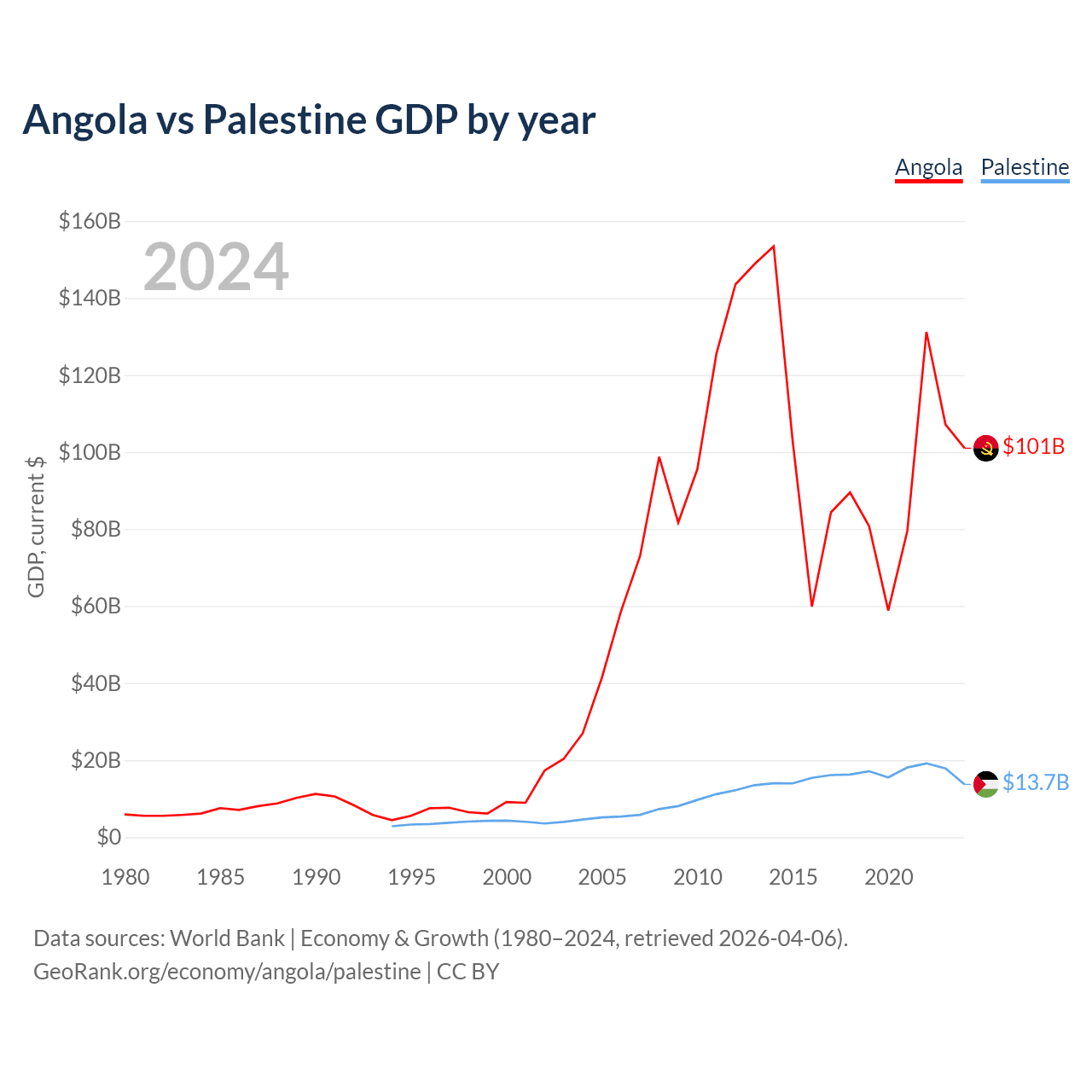 Angola has a GDP of $101B compared to $13.7B for Palestine, ranking 71/197 and 146/197 by economy size, respectively.