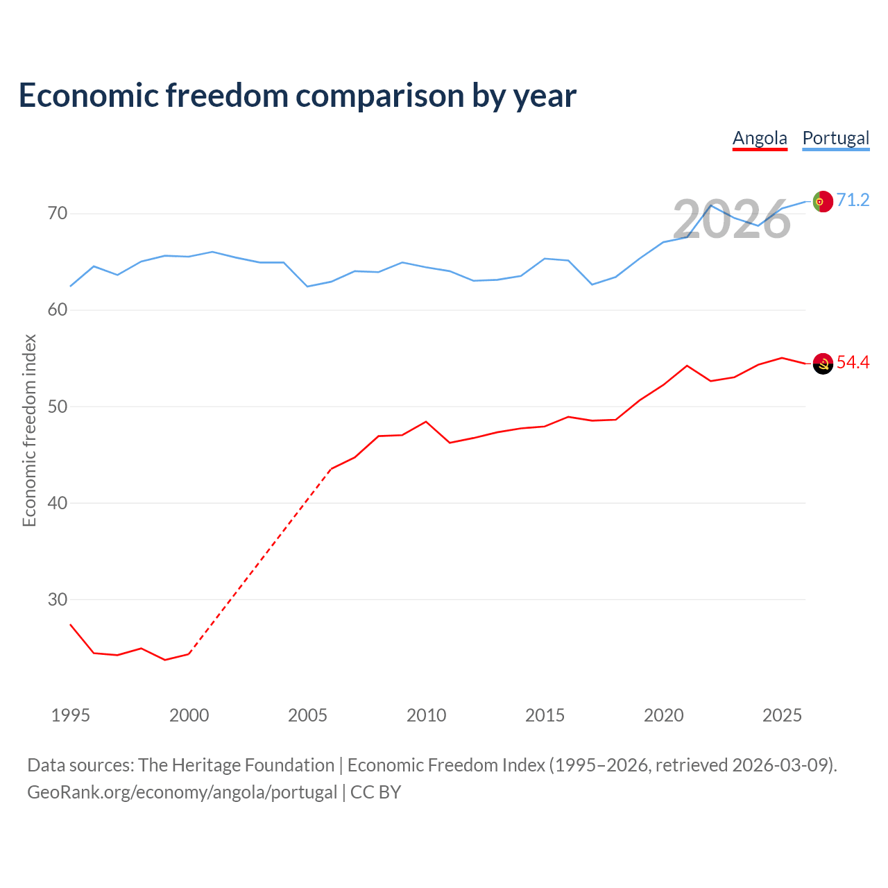The Economic Freedom Index for Angola is 54.4, ranking 133/197, compared to 71.2 for Portugal, ranking 33/197. The chart above displays a comparison of annual changes in economic freedom indexes.
