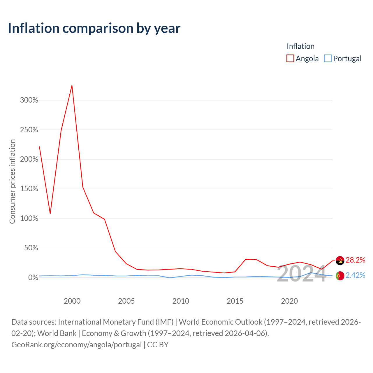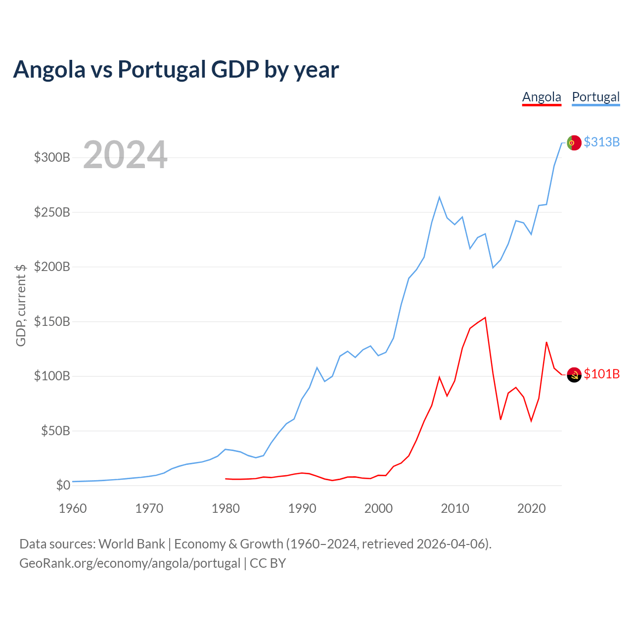 Angola has a GDP of $101B compared to $313B for Portugal, ranking 71/197 and 46/197 by economy size, respectively.
