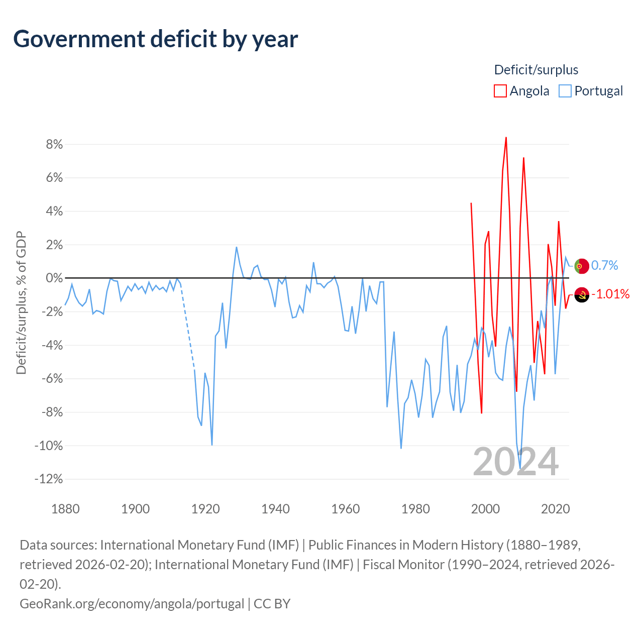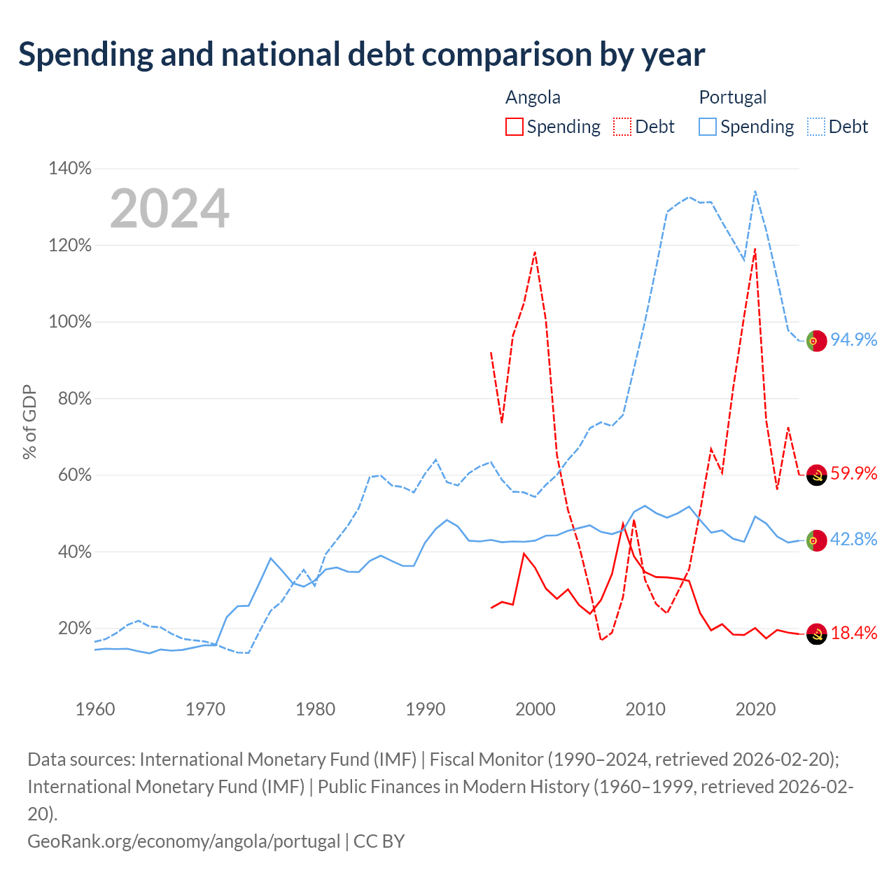 Angola has $60.5B in government debt (59.9% of GDP), compared to $297B (94.9% of GDP) in Portugal.