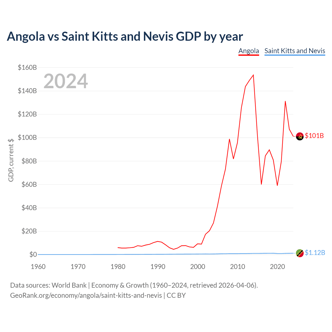 Angola has a GDP of $101B compared to $1.12B for Saint Kitts and Nevis, ranking 71/197 and 187/197 by economy size, respectively.