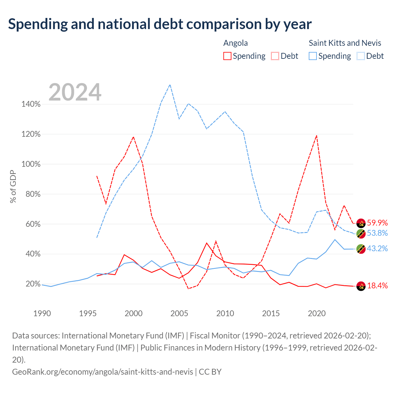 Angola has $60.5B in government debt (59.9% of GDP), compared to $604M (53.8% of GDP) in Saint Kitts and Nevis.