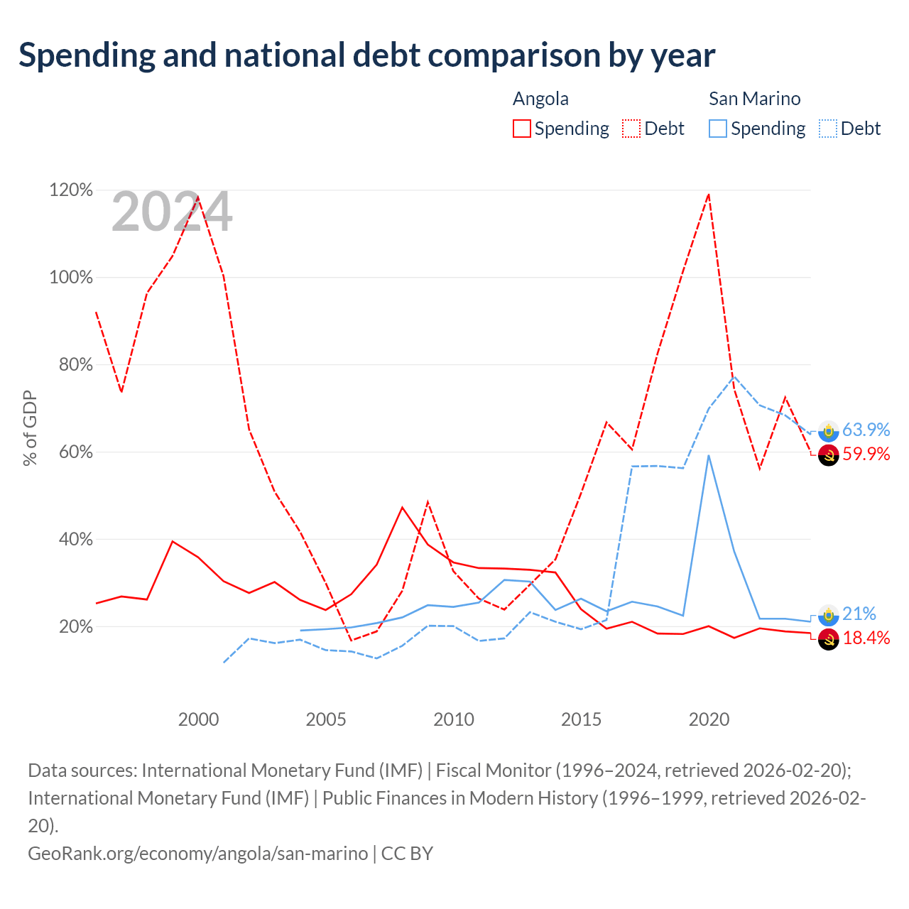 Angola has $60.5B in government debt (59.9% of GDP), compared to $1.39B (63.9% of GDP) in San Marino.