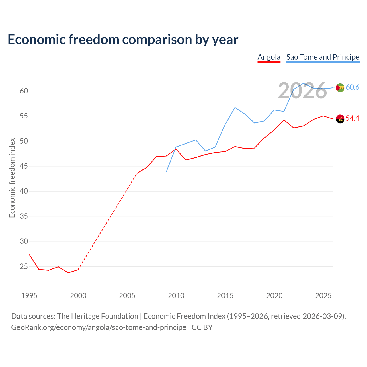 The Economic Freedom Index for Angola is 54.4, ranking 133/197, compared to 60.6 for Sao Tome and Principe, ranking 93/197. The chart above displays a comparison of annual changes in economic freedom indexes.