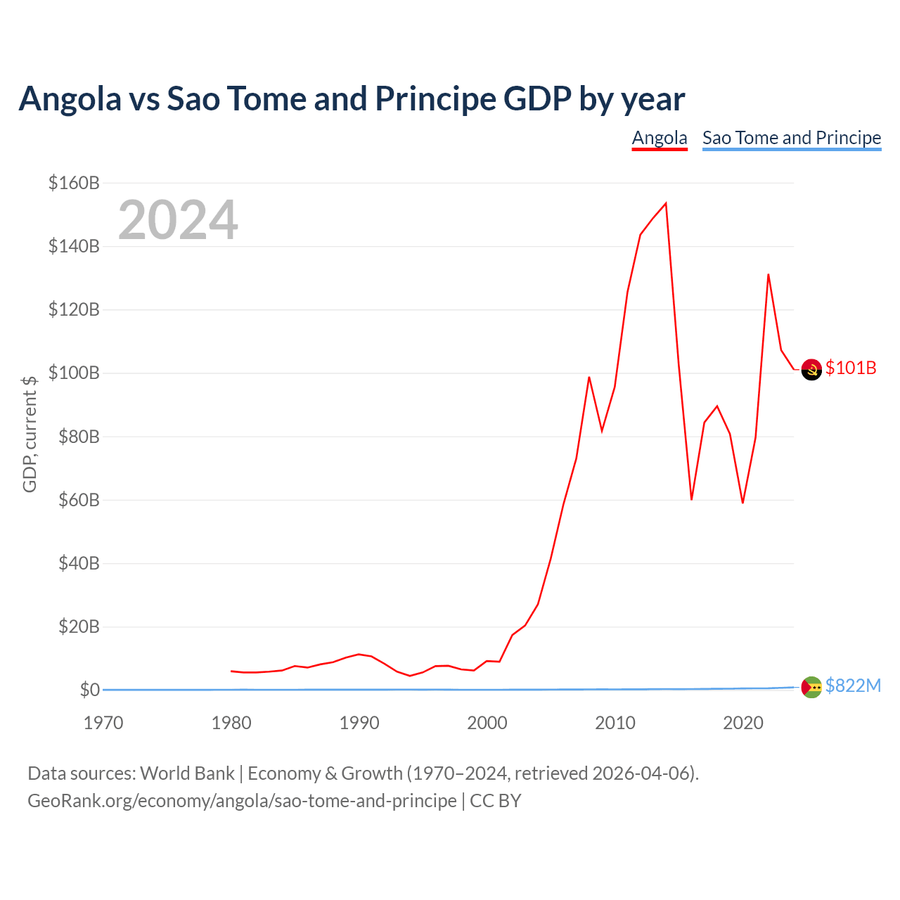 Angola has a GDP of $101B compared to $822M for Sao Tome and Principe, ranking 71/197 and 189/197 by economy size, respectively.