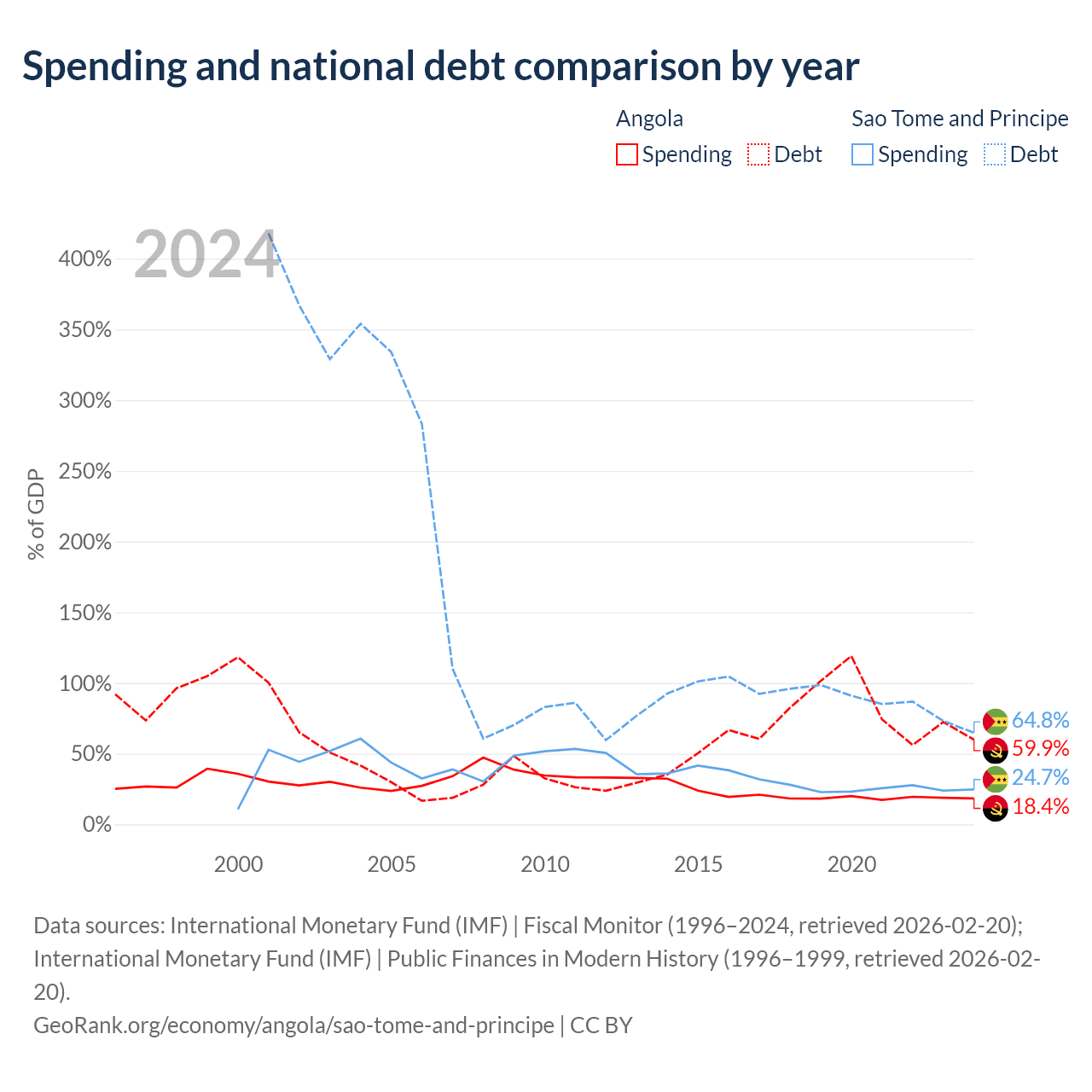 Angola has $60.5B in government debt (59.9% of GDP), compared to $533M (64.8% of GDP) in Sao Tome and Principe.
