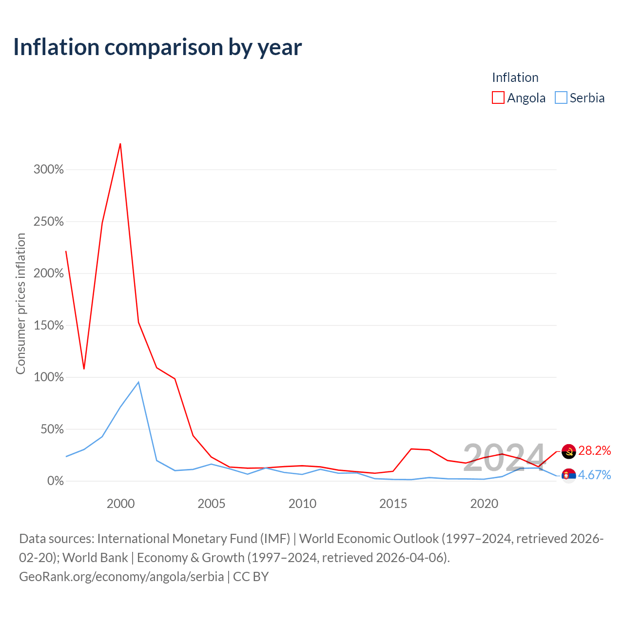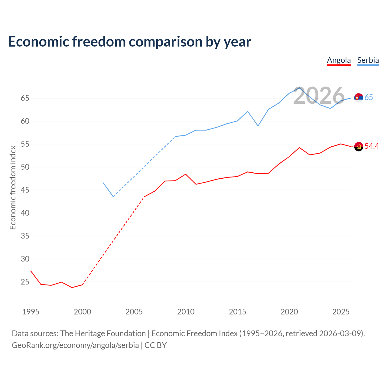 The Economic Freedom Index for Angola is 54.4, ranking 133/197, compared to 65 for Serbia, ranking 68/197. The chart above displays a comparison of annual changes in economic freedom indexes.
