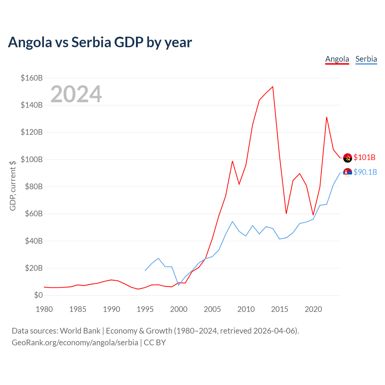 Angola has a GDP of $101B compared to $90.1B for Serbia, ranking 71/197 and 76/197 by economy size, respectively.
