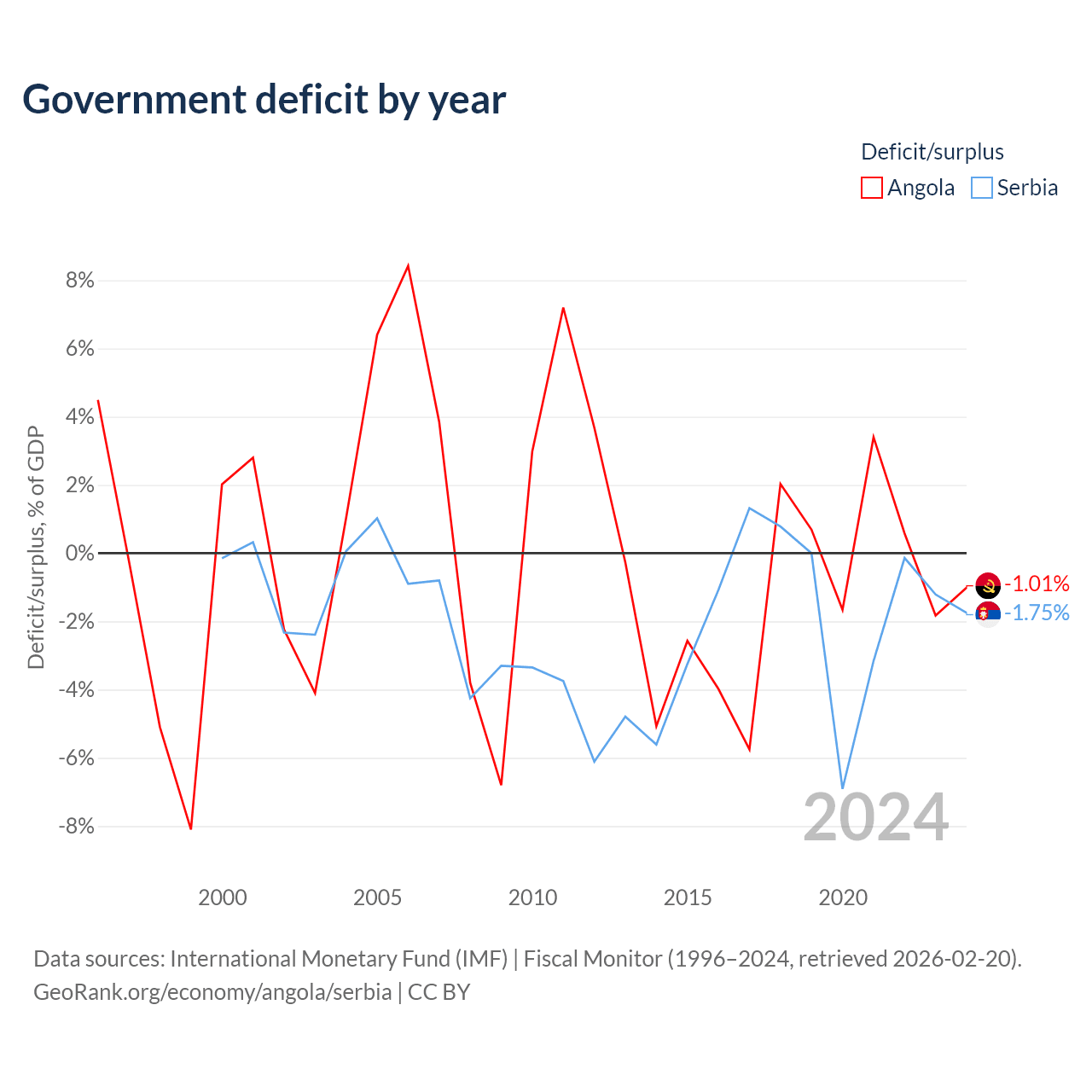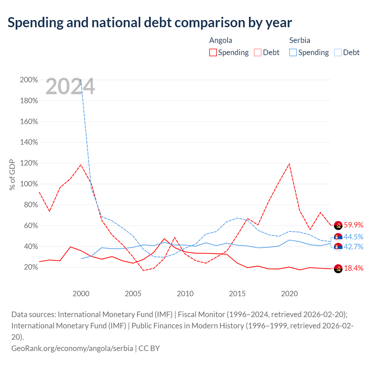 Angola has $60.5B in government debt (59.9% of GDP), compared to $40.1B (44.5% of GDP) in Serbia.