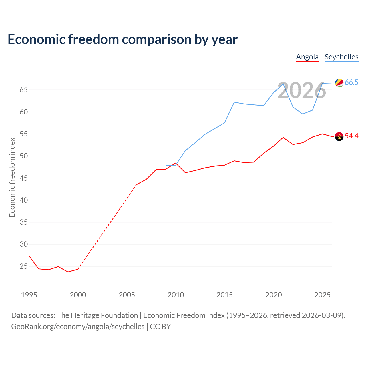 The Economic Freedom Index for Angola is 54.4, ranking 133/197, compared to 66.5 for the Seychelles, ranking 60/197. The chart above displays a comparison of annual changes in economic freedom indexes.