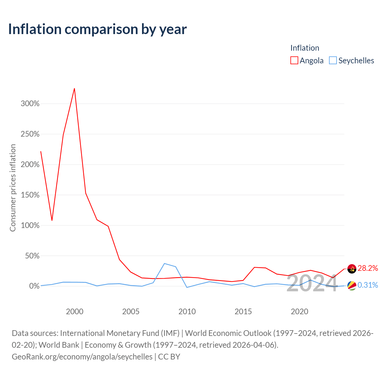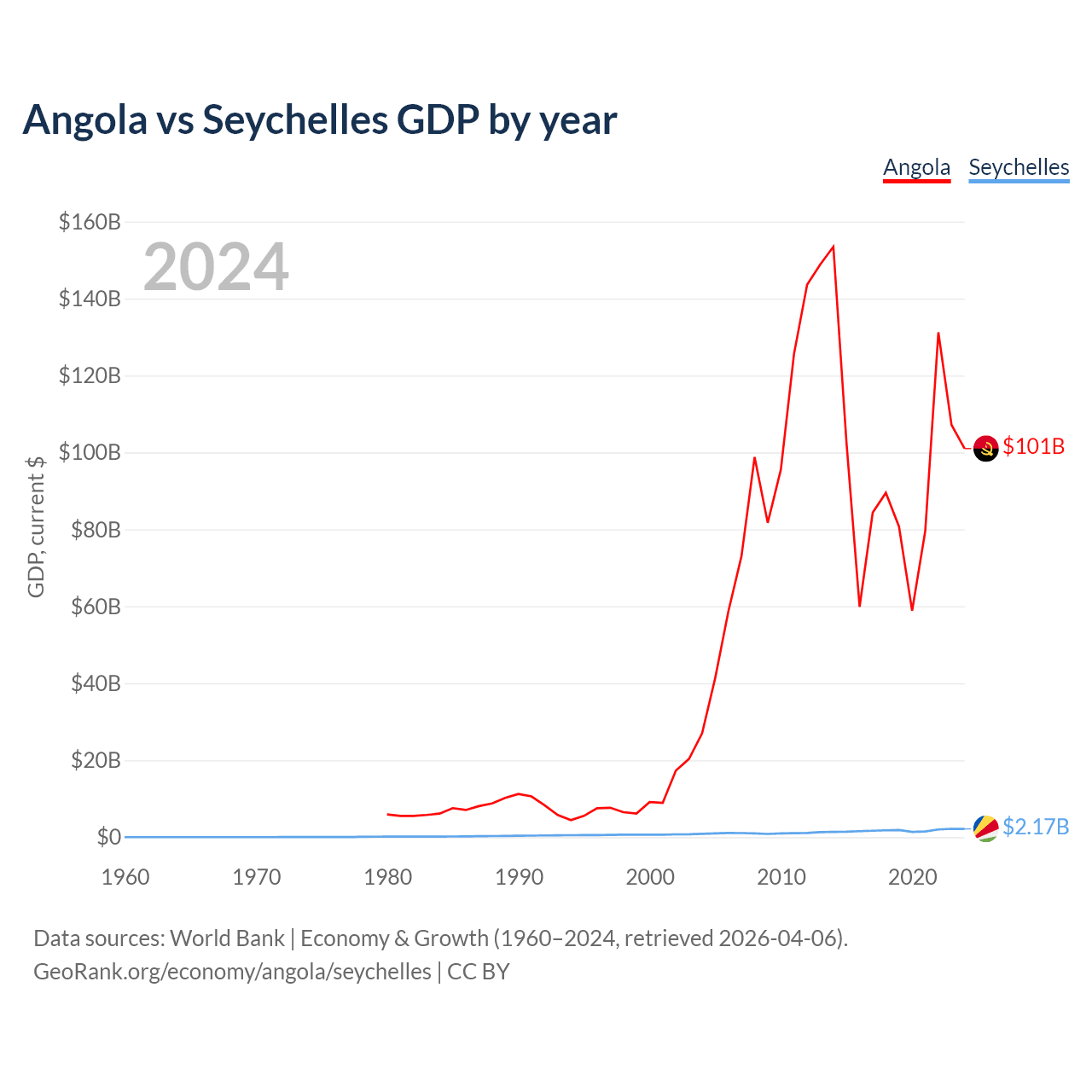 Angola has a GDP of $101B compared to $2.17B for the Seychelles, ranking 71/197 and 178/197 by economy size, respectively.