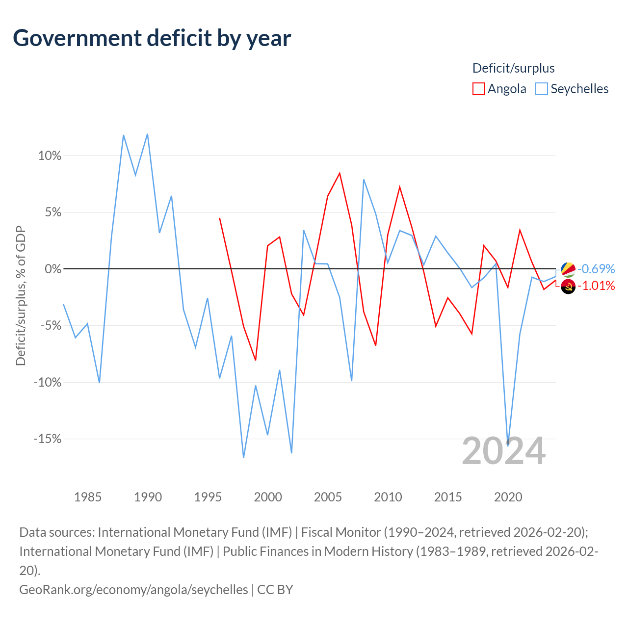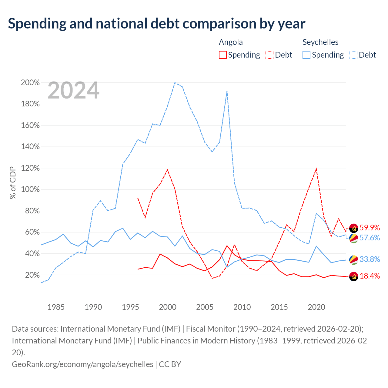Angola has $60.5B in government debt (59.9% of GDP), compared to $1.25B (57.6% of GDP) in the Seychelles.