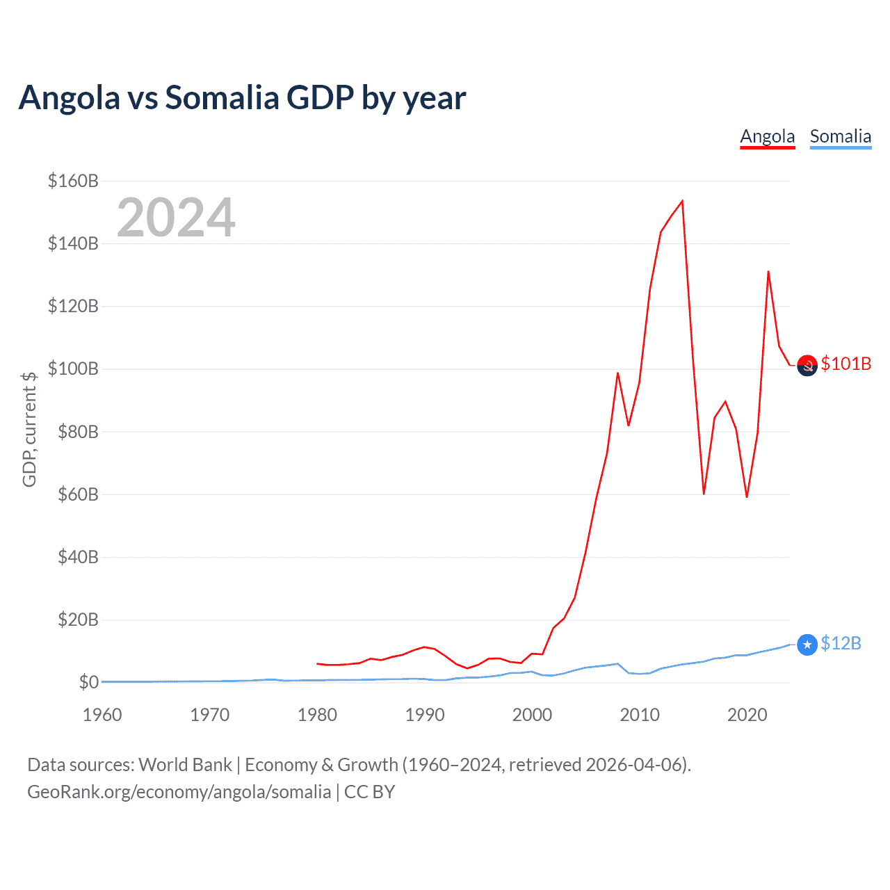 Angola has a GDP of $101B compared to $12B for Somalia, ranking 71/197 and 150/197 by economy size, respectively.