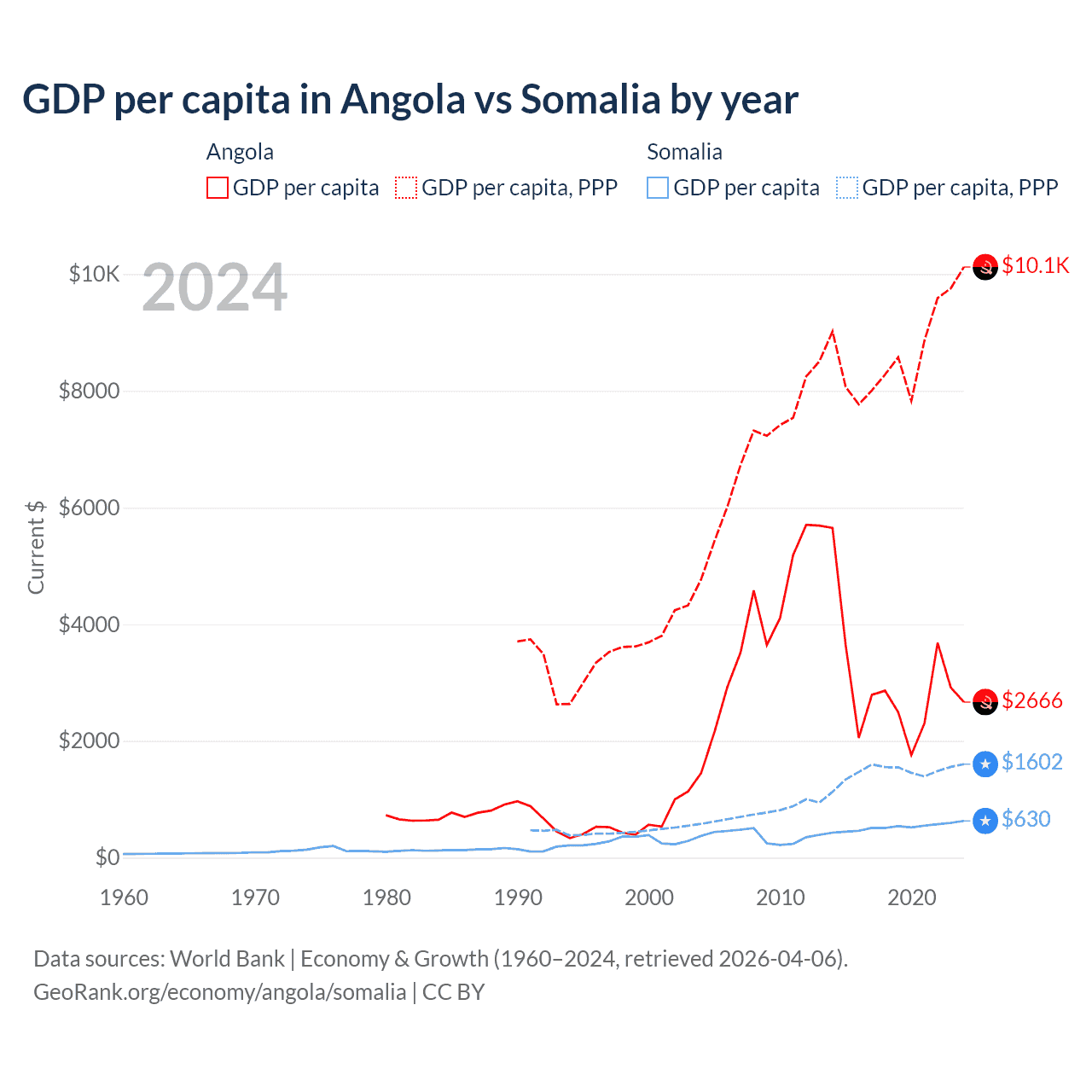 GDP per capita in Angola vs Somalia by year
