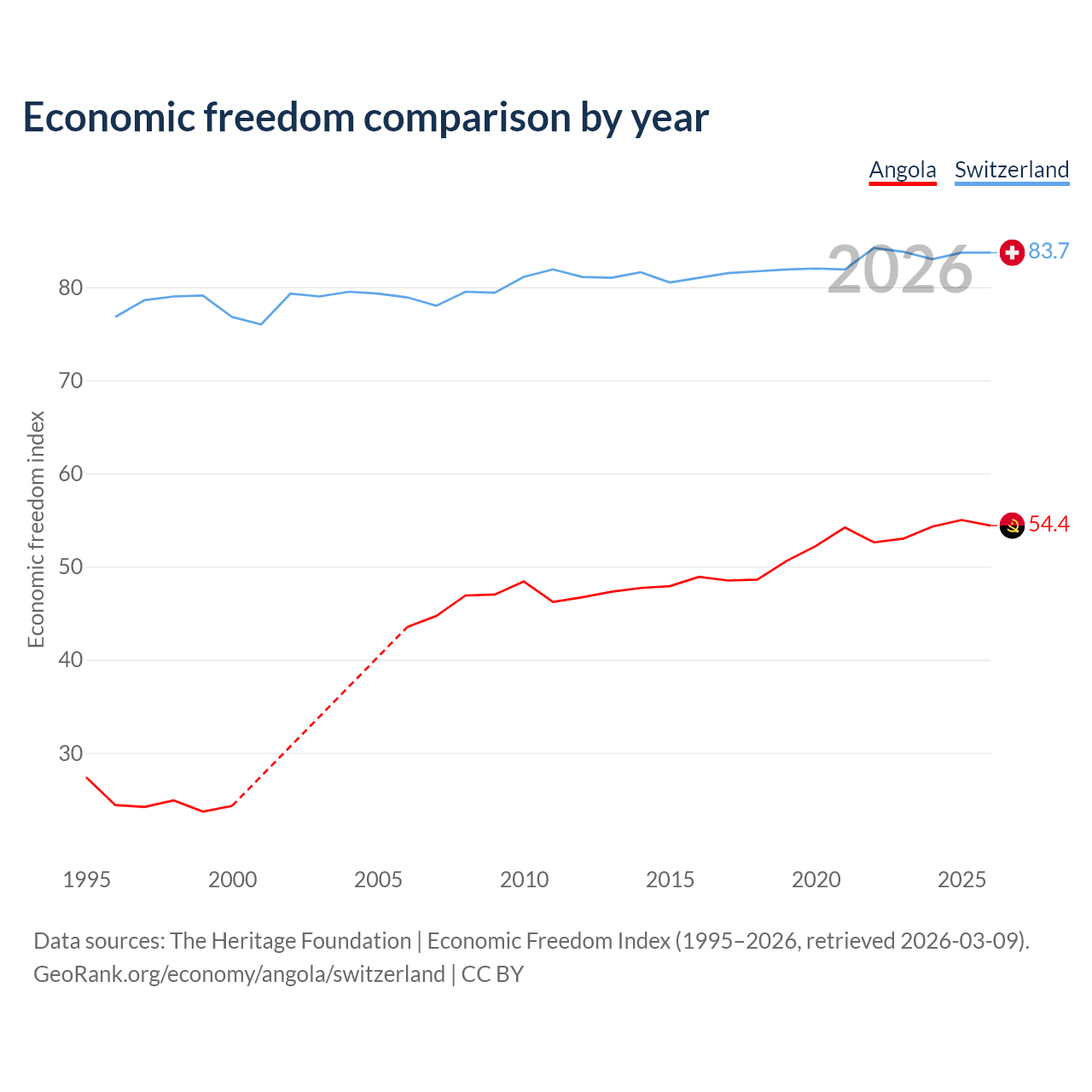 The Economic Freedom Index for Angola is 54.4, ranking 133/197, compared to 83.7 for Switzerland, ranking 2/197. The chart above displays a comparison of annual changes in economic freedom indexes.