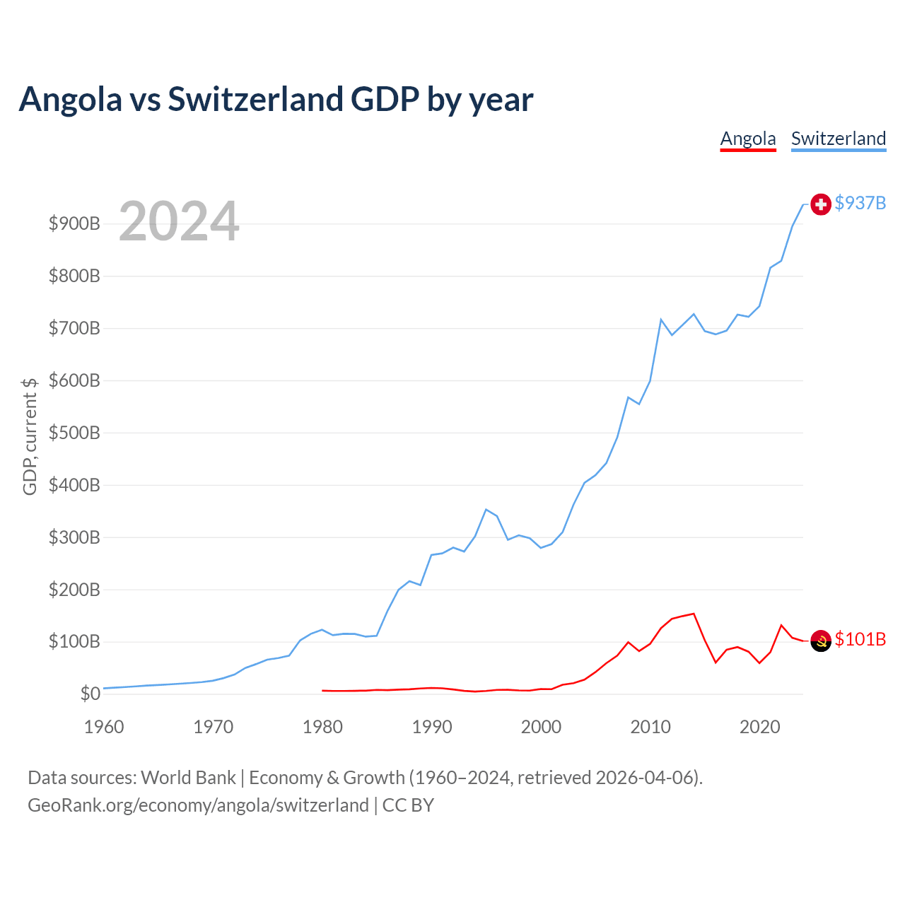 Angola has a GDP of $101B compared to $937B for Switzerland, ranking 71/197 and 20/197 by economy size, respectively.