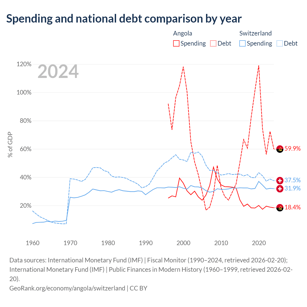 Angola has $60.5B in government debt (59.9% of GDP), compared to $351B (37.5% of GDP) in Switzerland.