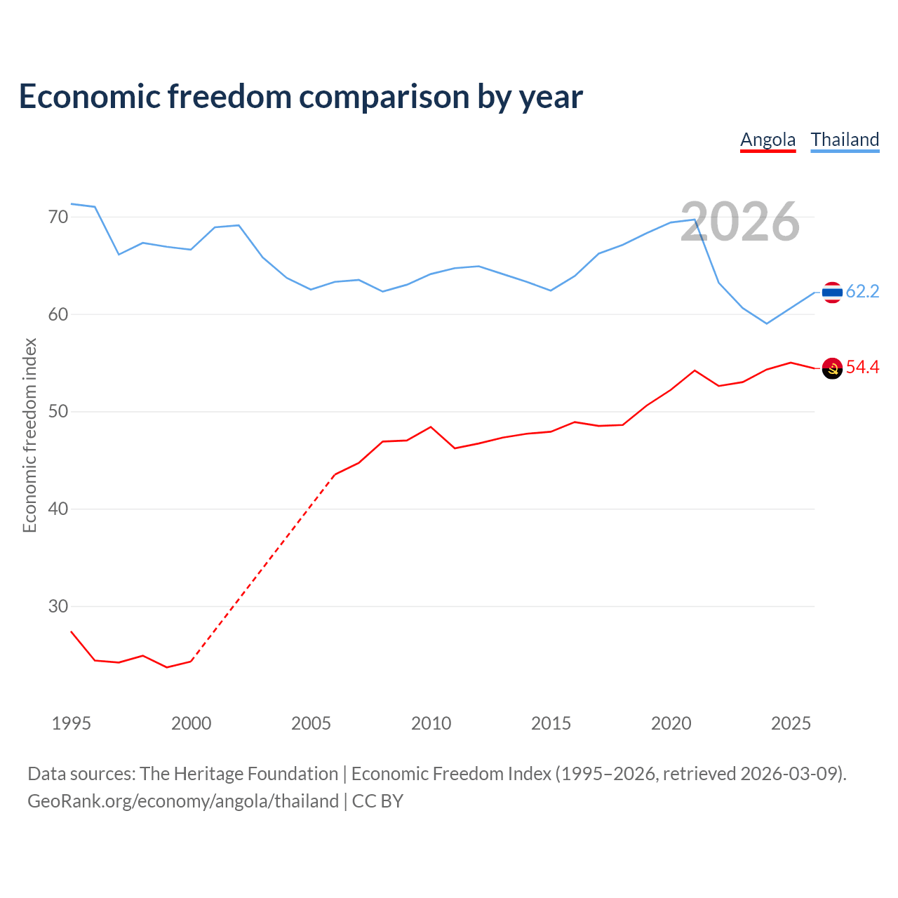 The Economic Freedom Index for Angola is 54.4, ranking 133/197, compared to 62.2 for Thailand, ranking 88/197. The chart above displays a comparison of annual changes in economic freedom indexes.
