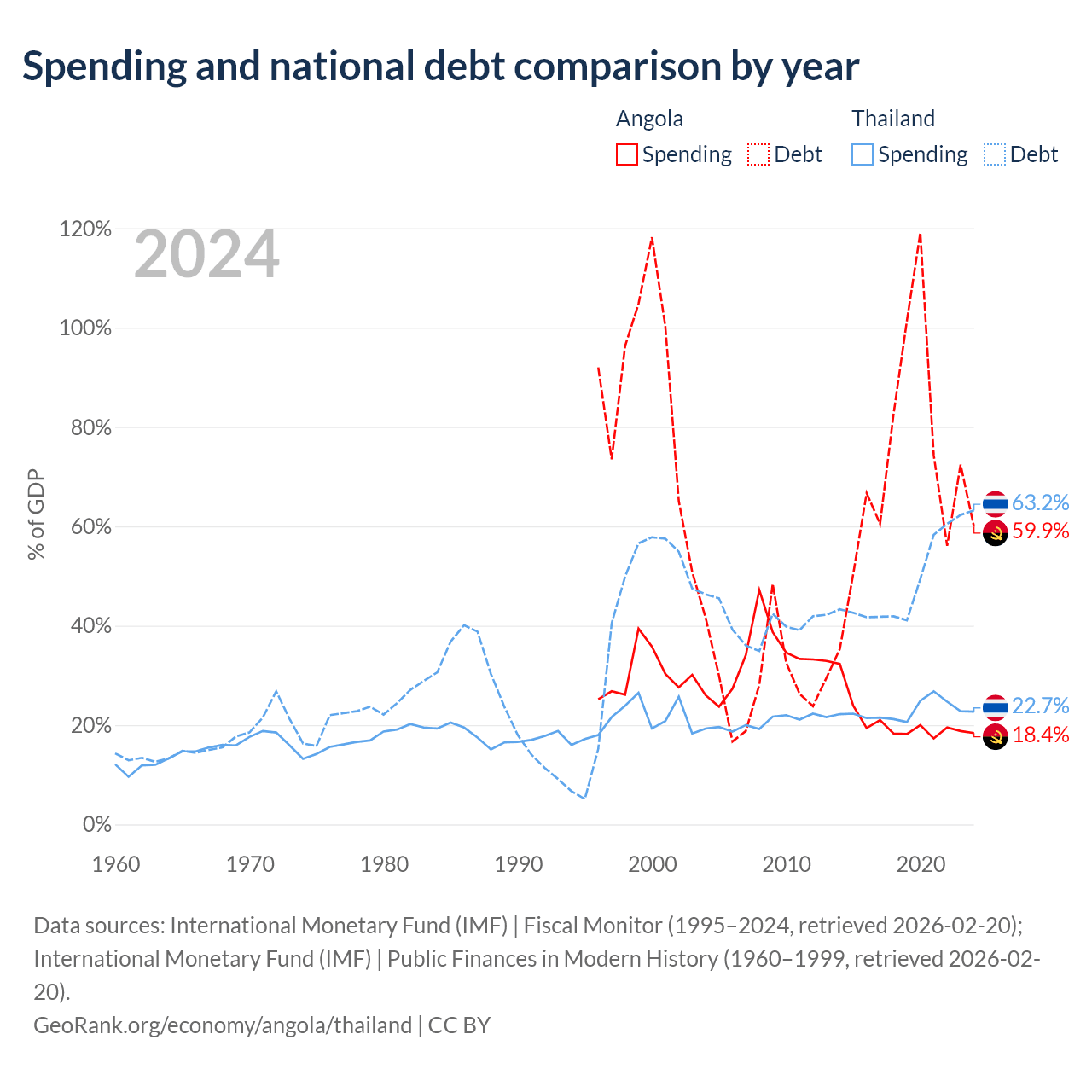Angola has $60.5B in government debt (59.9% of GDP), compared to $333B (63.2% of GDP) in Thailand.