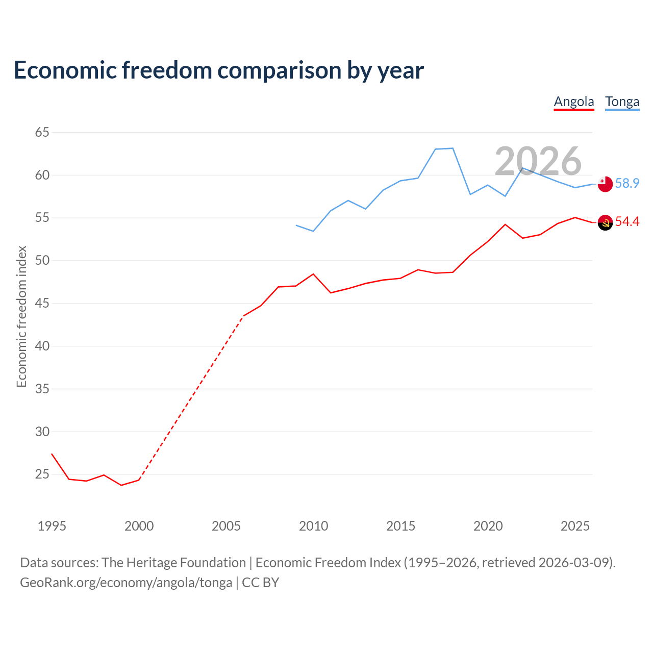 The Economic Freedom Index for Angola is 54.4, ranking 133/197, compared to 58.9 for Tonga, ranking 107/197. The chart above displays a comparison of annual changes in economic freedom indexes.