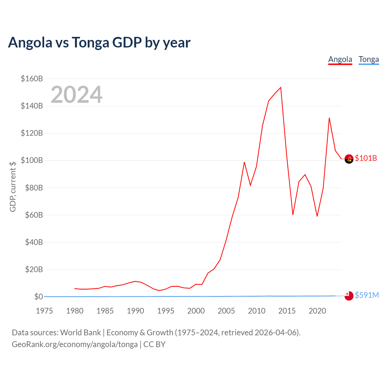 Angola has a GDP of $101B compared to $591M for Tonga, ranking 71/197 and 191/197 by economy size, respectively.