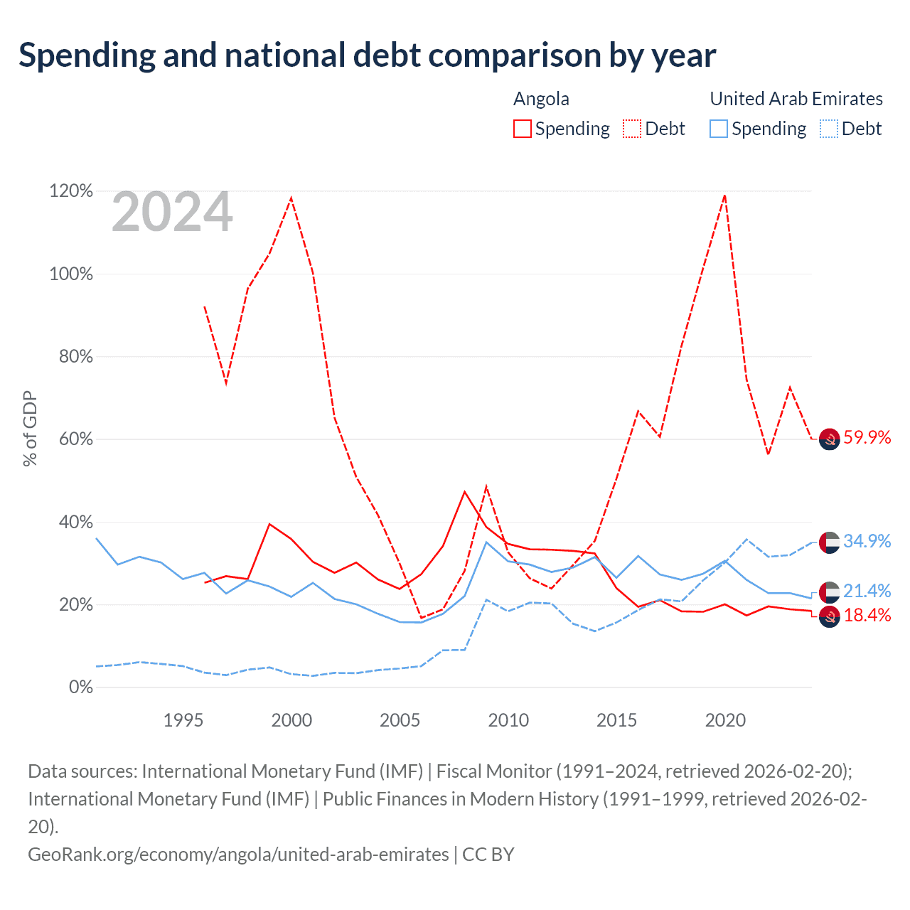 Angola has $60.5B in government debt (59.9% of GDP), compared to $193B (34.9% of GDP) in the United Arab Emirates.
