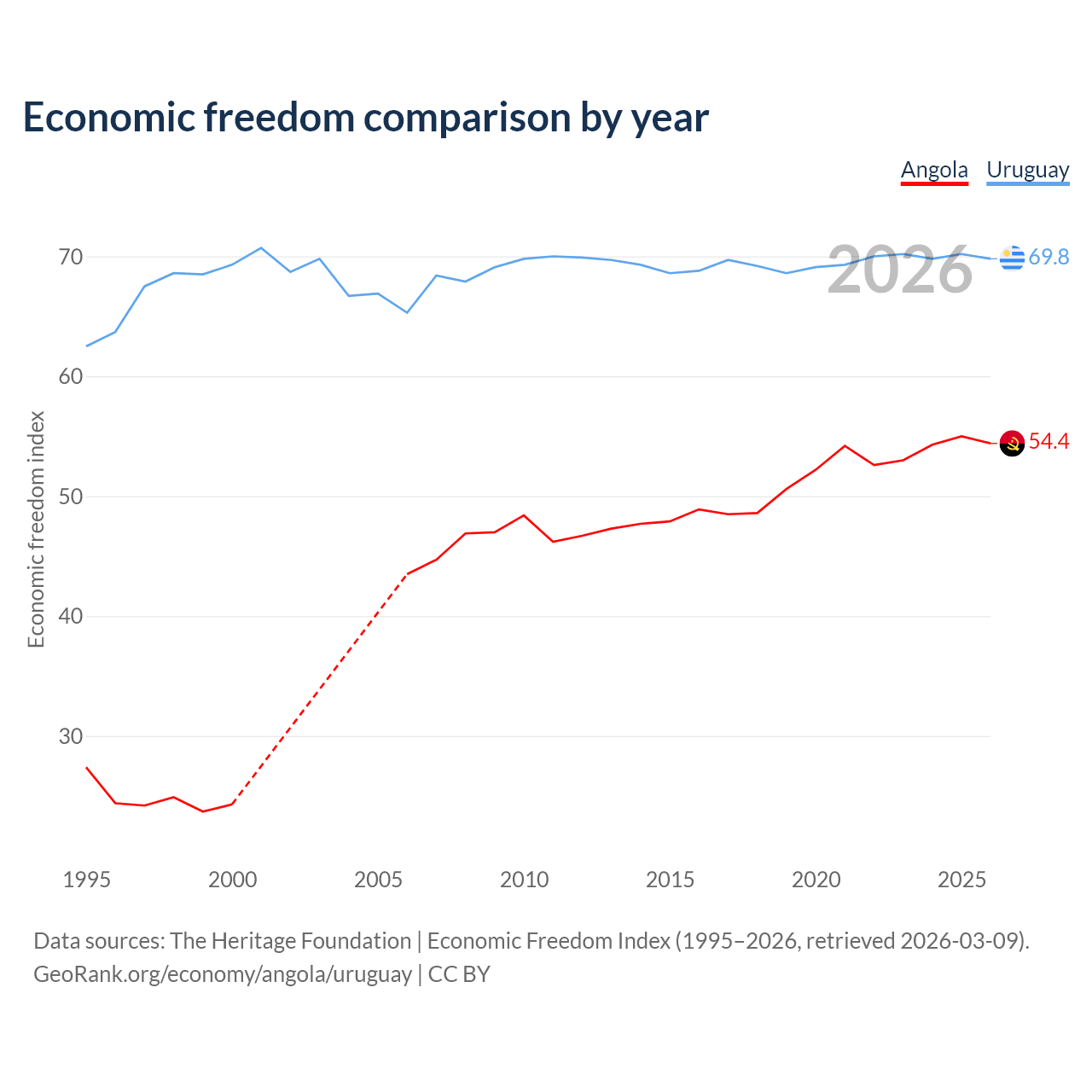 The Economic Freedom Index for Angola is 54.4, ranking 133/197, compared to 69.8 for Uruguay, ranking 39/197. The chart above displays a comparison of annual changes in economic freedom indexes.