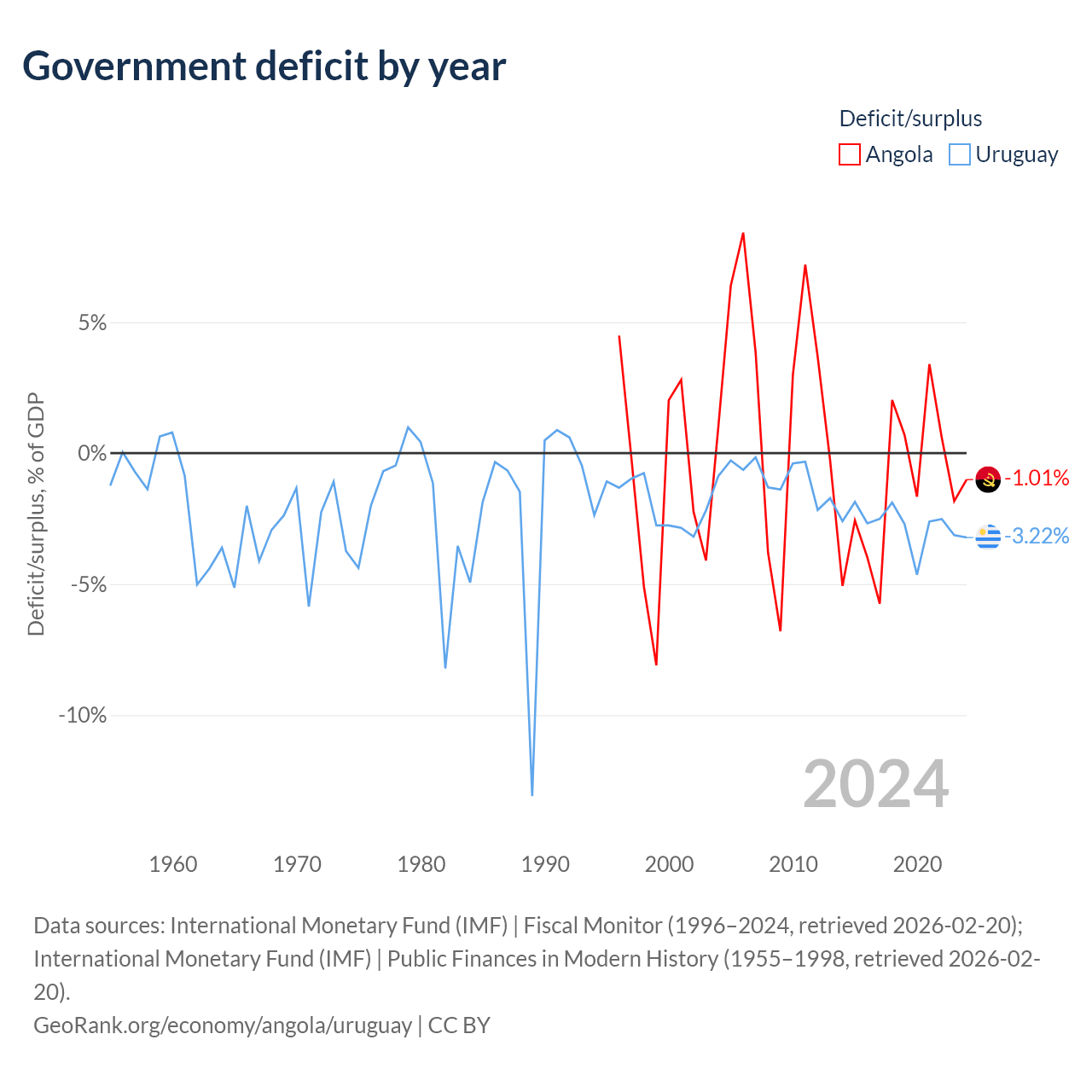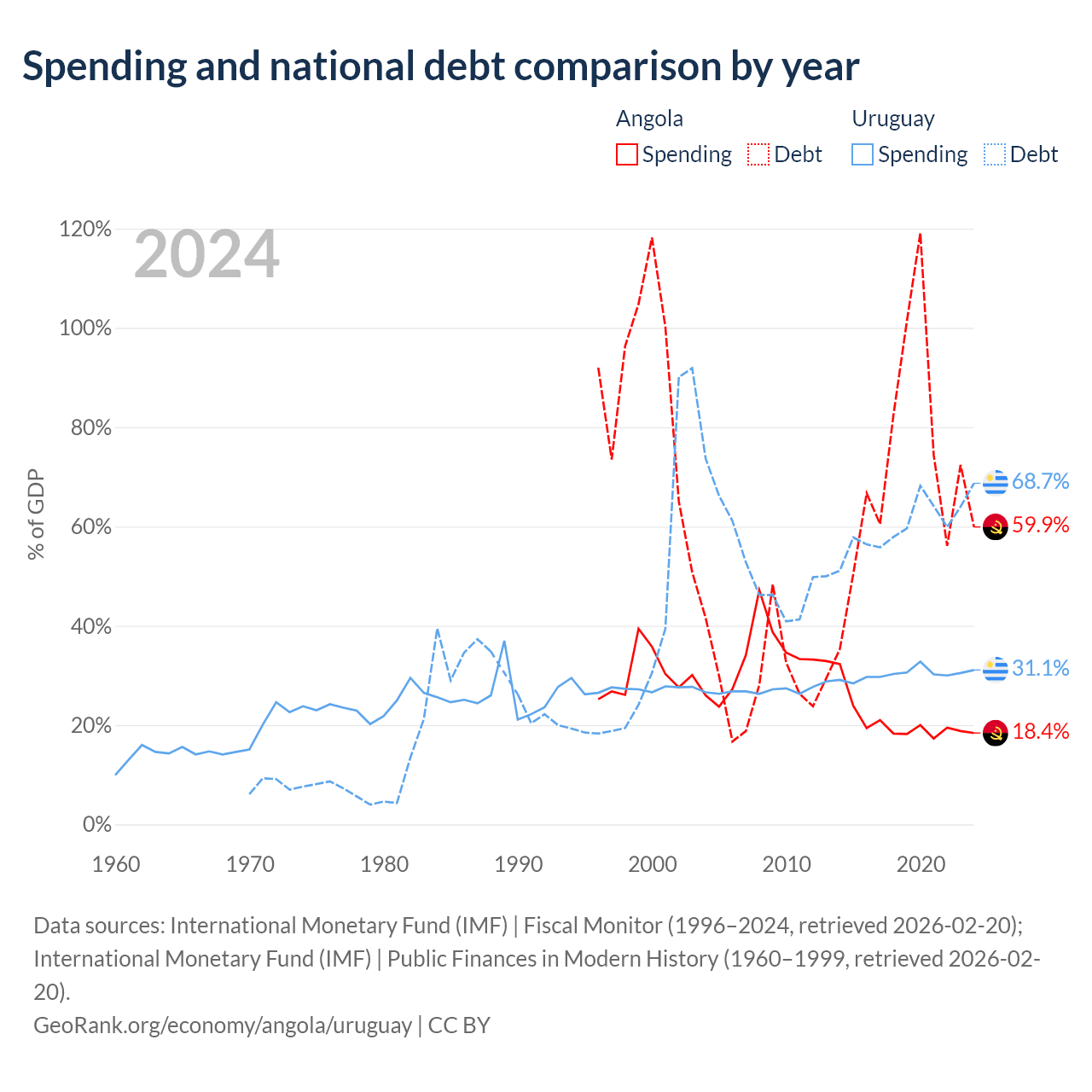 Angola has $60.5B in government debt (59.9% of GDP), compared to $55.6B (68.7% of GDP) in Uruguay.