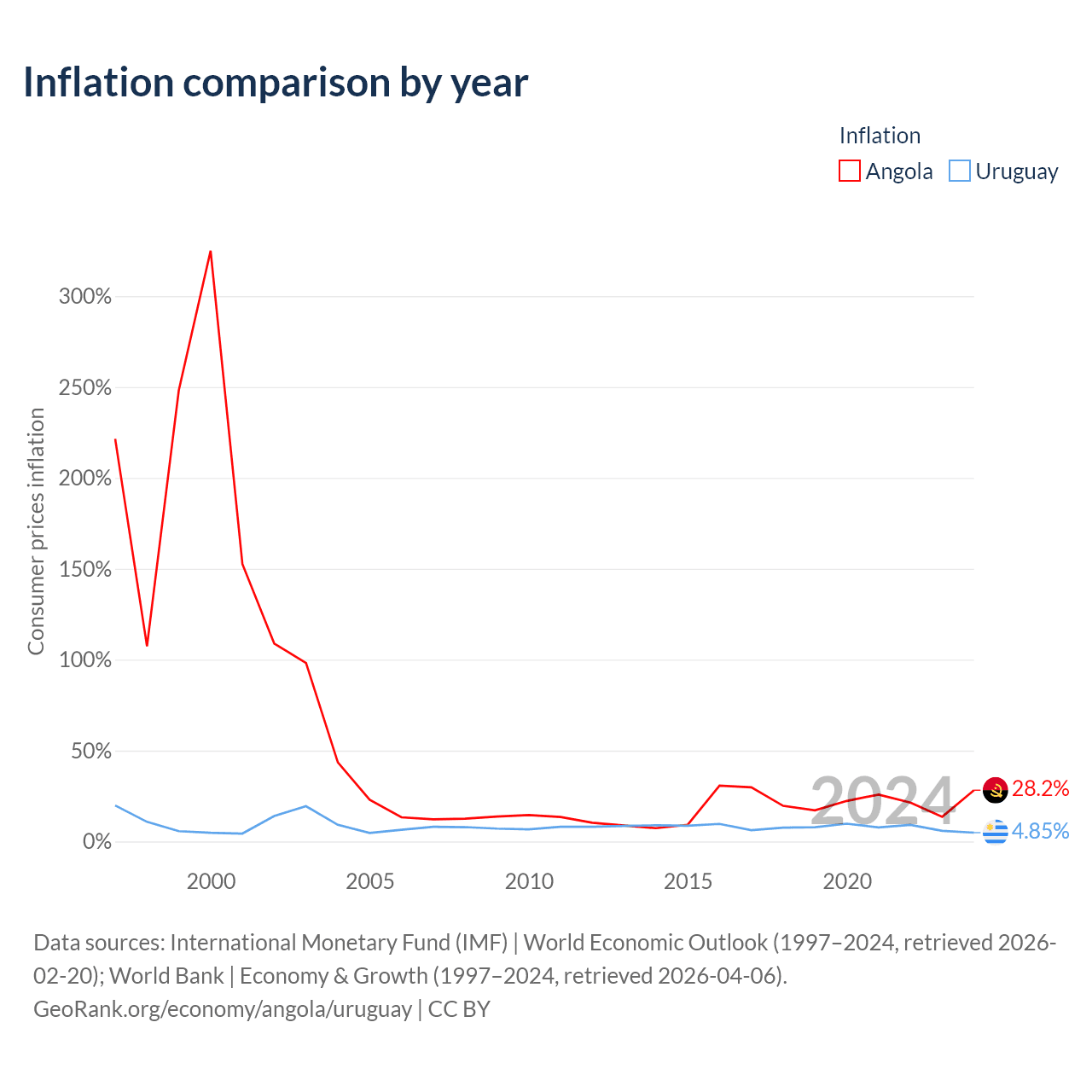 Angola has a GDP of $101B compared to $81B for Uruguay, ranking 71/197 and 81/197 by economy size, respectively.